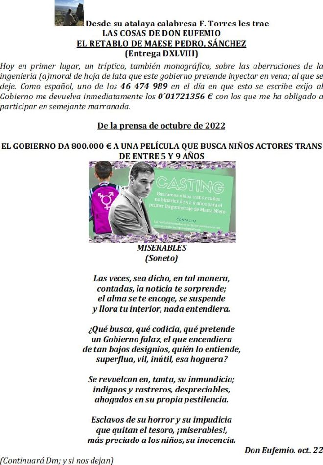 Otra cosa es, y es lo que denuncio, en palabras no mías sino de la prensa es, y vuelva leer más arriba si a bien lo tiene: “El Gobierno subvenciona con 800. 000 € una película que busca actores trans entre 5 y 9 años”; y puede seguir leyendo todas las noticias entresacadas de la misma que dan pie a mis primeros tres sonetos de hoy. El modo de expresar mi denuncia, en endecasílabos… En ellos
