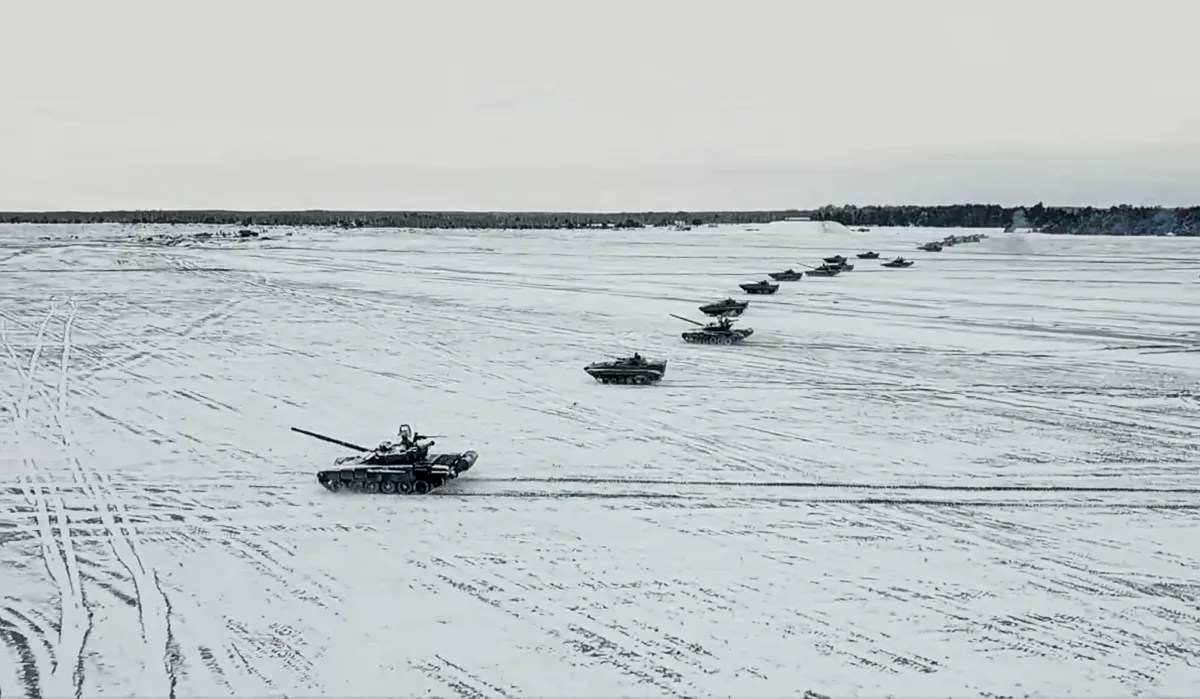 Tanques y vehículos blindados se desplazan durante maniobras militares conjuntas entre Bielorrusia y Rusia en el polígono de tiro de Brestsky, en Bielorrusia. (Associated Press)