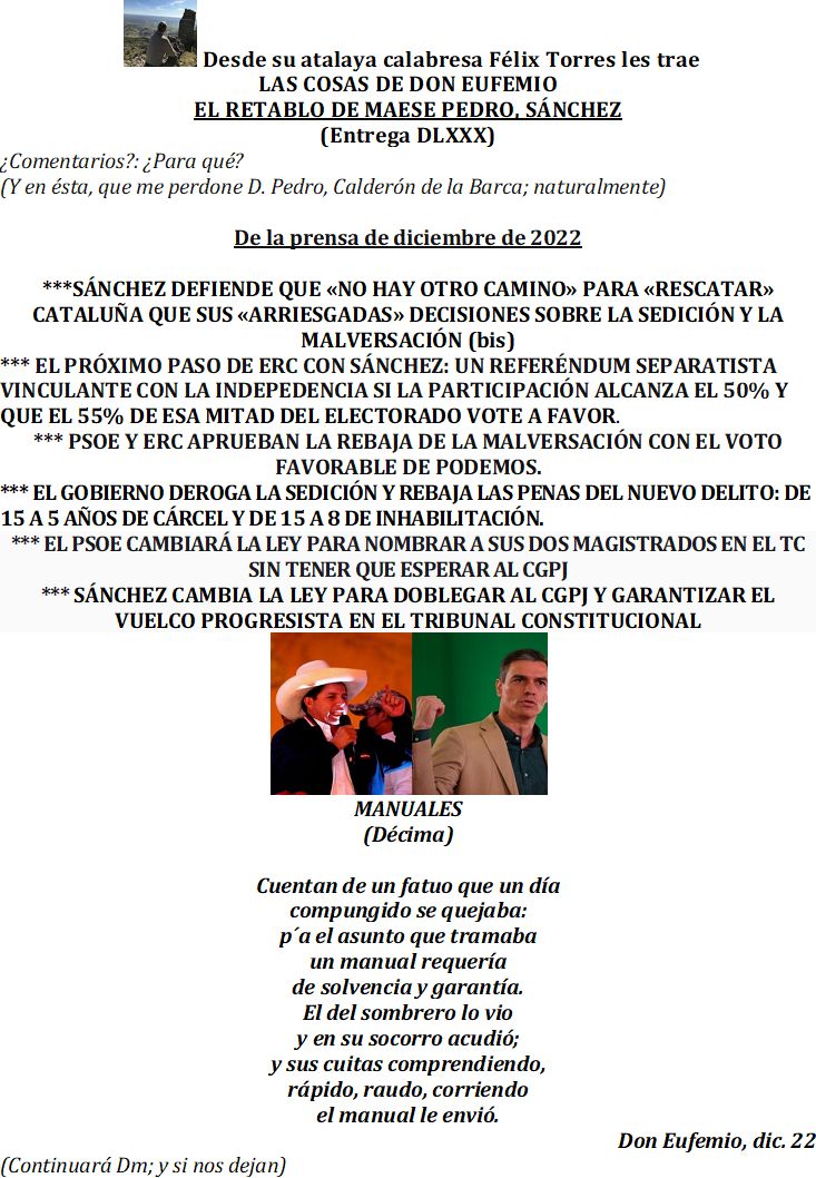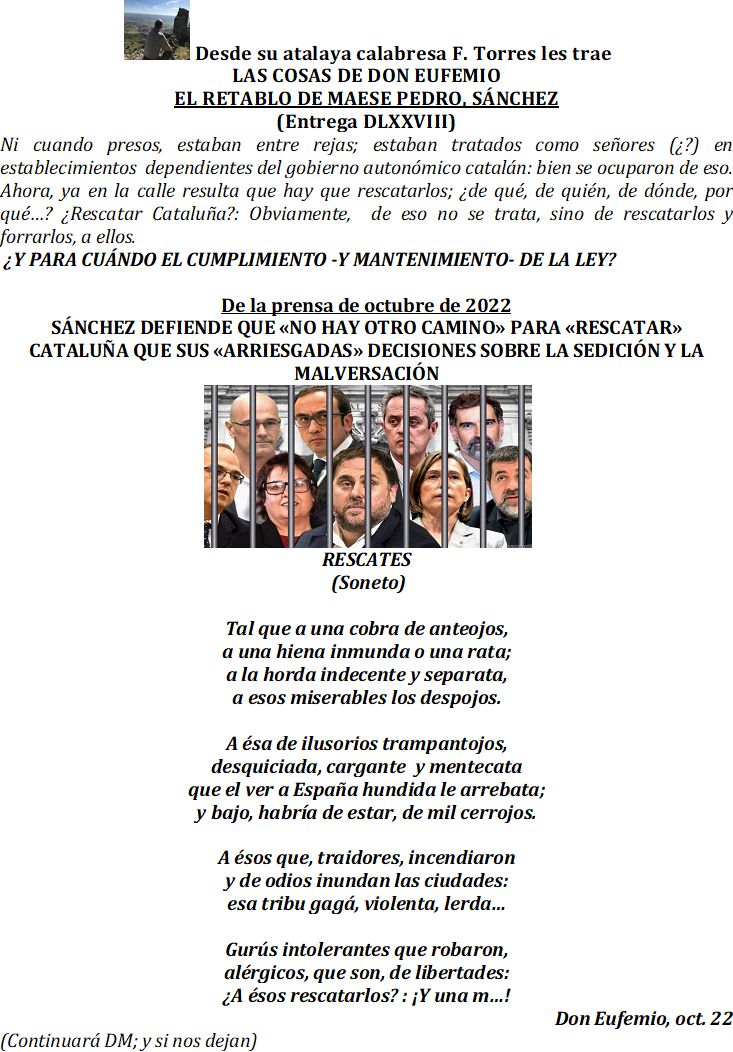 Como siempre tan acertado en sus escritos y sonetos Mi Coronel. ¿Que se puede hacer con toda esta tropa de indeseables? Desde Mongolia, hasta el más ínfimo secuaz de este descontrol, necesitan ir al Polo Norte sin alimentos, para ver si se les aclaraban las ideas, o dejarlos en el desierto de Gobi sin agua .para ver si su inteligencia mejoraba un poco y se dejasen de tonterías,, que lo único que sirve, es para que cada vez tengamos más inestabilidad gubernativa y miedo a lo que está por venir. Muchas gracias y saludos para todos.