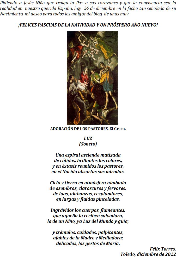 Don Félix, de la obra del El Greco que ha escogido, es «una pasada» como dicen los modernos. La intensa luz que emite el Niño y que baña al grupo que lo contempla es única. Me encanta el efecto de bóveda celeste que forman los ángeles. Como seguro sabe el MET de Nueva York posee una versión de taller con ligeras variaciones, realizada, según parece, en fechas similares a las del lienzo original que tenemos en El Prado (el Estado lo compró a unas monjitas de Toledo donde creo recordar fue enterrado en un primer momento el artista que nos trae este precioso christmas) ¡¡¡Feliz Navidad!!!