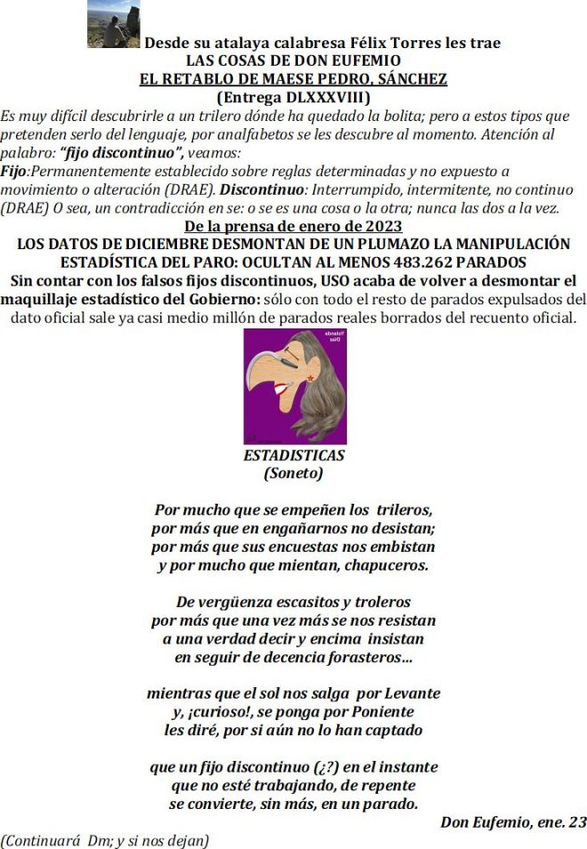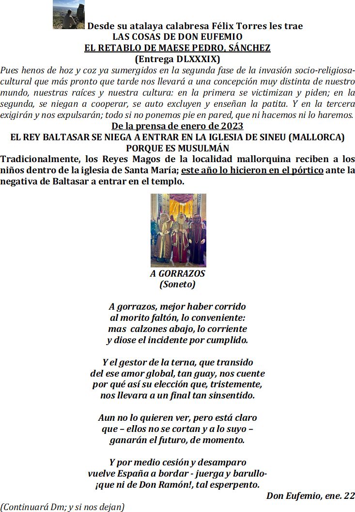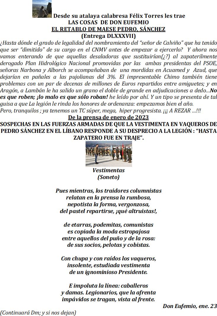 Como siempre, muchas gracias Mi coronel por tan espléndido escrito y sonetos. En cuanto a los «Barones» del Psoe, son todos iguales, el que tenemos en nuestra comunidad, Lambán es igual que los otros, mientras aquí están los pocos hospitales, sin médicos, por lo tanto largas listas de espera, los «enchufes» a la antigua, están a la orden del día. El «ocupa» presentándose en vaqueros, no tiene dignidad, y en cuanto a Baltasar, lo primero que tenían que haber hecho, es preguntarle por su religión, y no, luego plegarse a «sus deseos», vamos que al último nos van a decir estos sujetos si podemos o no entrar en una Iglesia, o ponernos el dichoso velo. Vergüenza me da todo esto. Saludos para todos.