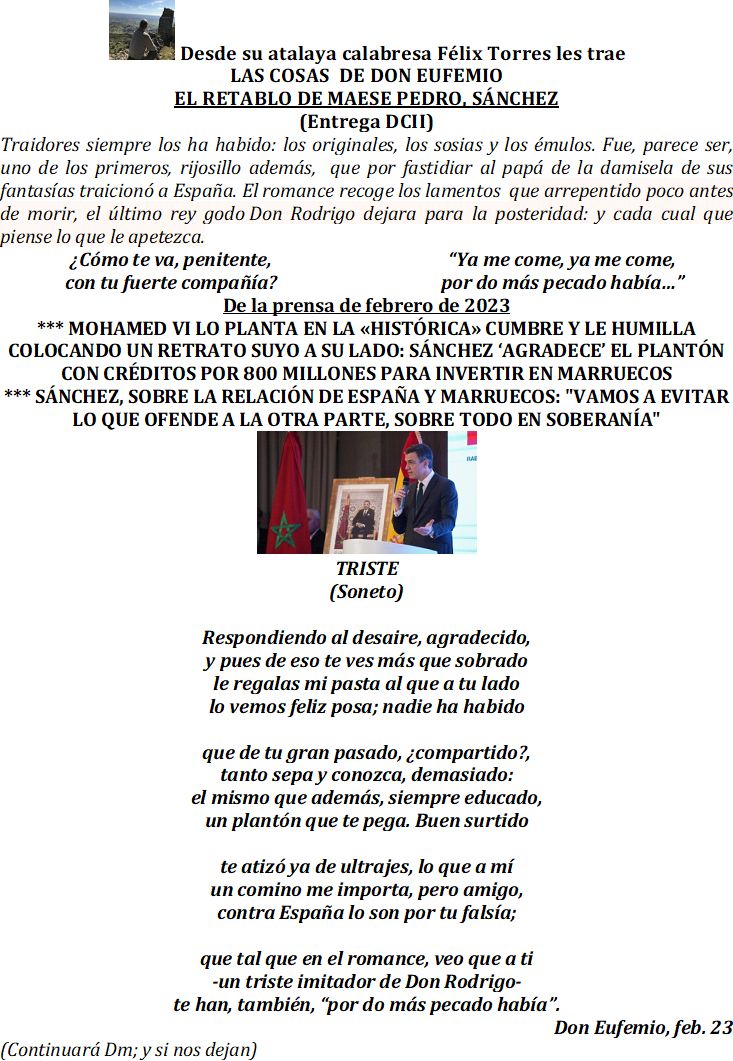 Y, aunque ya estamos acostumbrados a las muestras de bajeza de Sánchez, no podemos dejar pasar de largo, la falta de hombria demostrada por la humillante actuación del Jefe del Gobierno español ante el Rey de Marruecos.