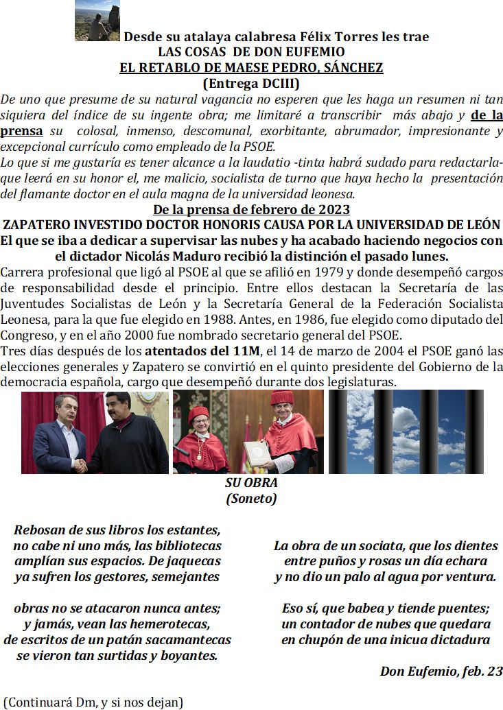 6. Está visto, mi Coronel, que no pasará dia sin que una nueva «sorpresa» nos conturbe el ánimo; Zapatero recibiendo un titulo de una Universidad española. Luzbel se ha aposentado en la tierra y está ganando batallas. Que semejante individuo, traidor por excelencia a la Patria, sea honrado por la Institución mas elevada dedicada a la formación de la juventud nos denota el grado de corrupción existente y el de como saldran los que cursan sus estudios en ella.