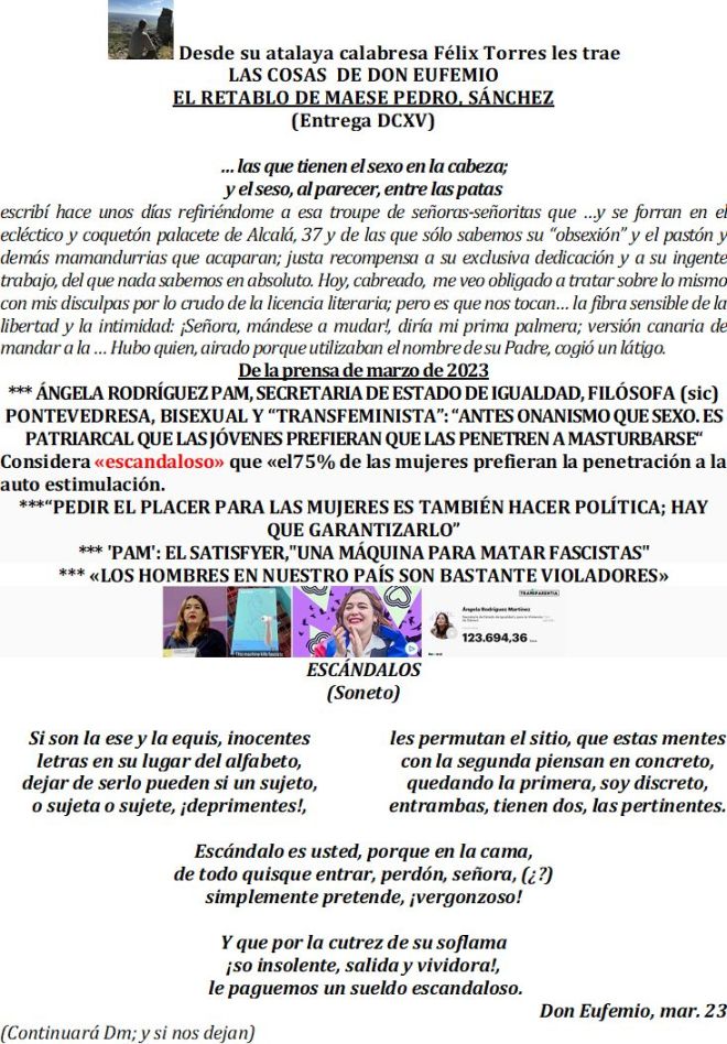 4. Buenos días, mi Coronel y todos; en mis tiempos el Rol Patriarcal consistia en vigilar al Novio; en cualquier caso, era el Novio quien tenía el problema con el Patriarcado. Va a ser que la PAM va a ser como el Avaro de Moliere, el Antipatriarca por excelencia, que confundia la Olla de Guardar Monedas, con la Honra de la Hija.