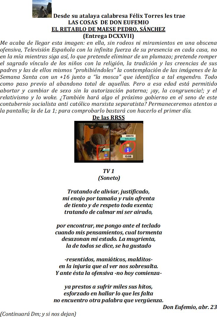 Y a cambio de estos, y otros peores (des) méritos, a la PAM/LATA (de Spam), la montamos una DiscoTorti, al amigo Berniador un máster de Filología Pekinesa, al Acosador de su Novia, las ganas, porque ya hay que tener ganas para eso, mientras que la TVE se la dejamos ver a Rita la Cantaora, porque la Lola, esa Lola que al final NO fue los Puertos, prefiere mirarse en los ojos del (ex) Justicio Garzón, que contemplar la Procesión, sin Niños, por Televisión. Buenos días, D. Eufemio y todos.