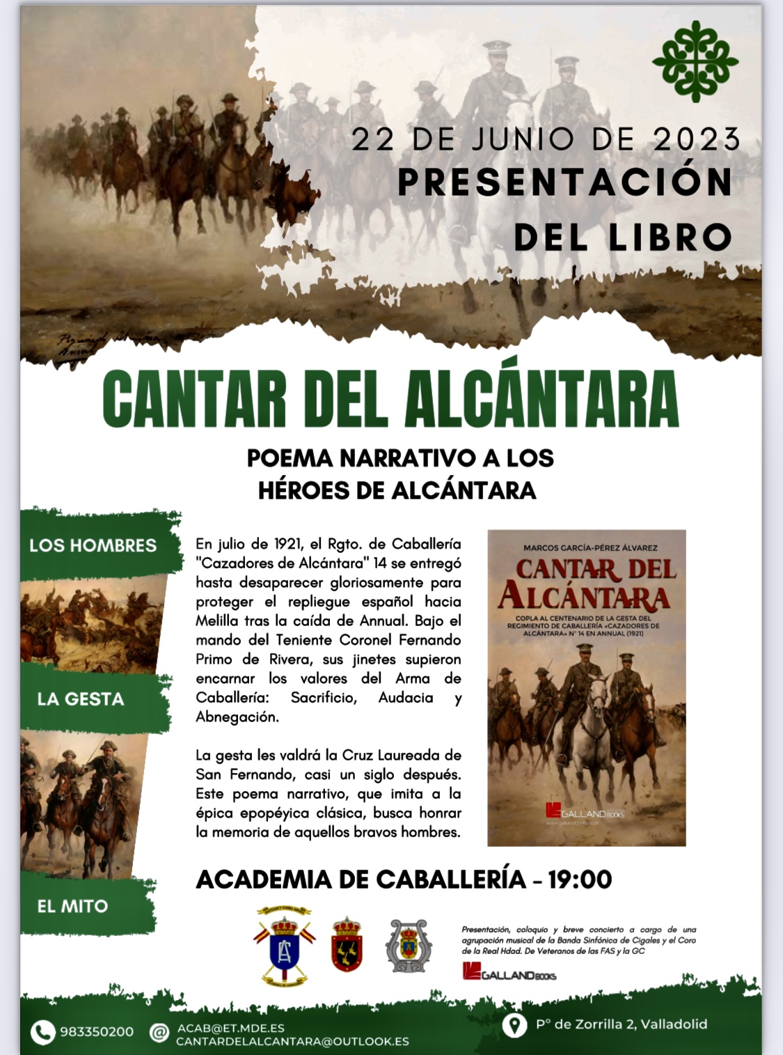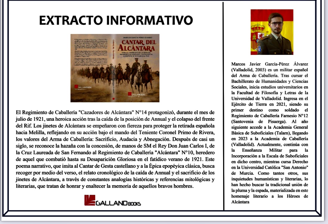 Escrita por el militar vallisoletano Marcos García-Pérez Álvarez (Actual alumno de EMIES en la ACAB), persigue emular las formas de la épica epopéyica clásica y el cantar de gesta castellano, recurriendo a múltiples alusiones mitológicas, históricas y bíblicas. Su pretexto es el de ensalzar la figura de los Héroes de Alcántara en el XI aniversario de la concesión colectiva al Regimiento «Alcántara» 10 de la Cruz Laureada de San Fernando.