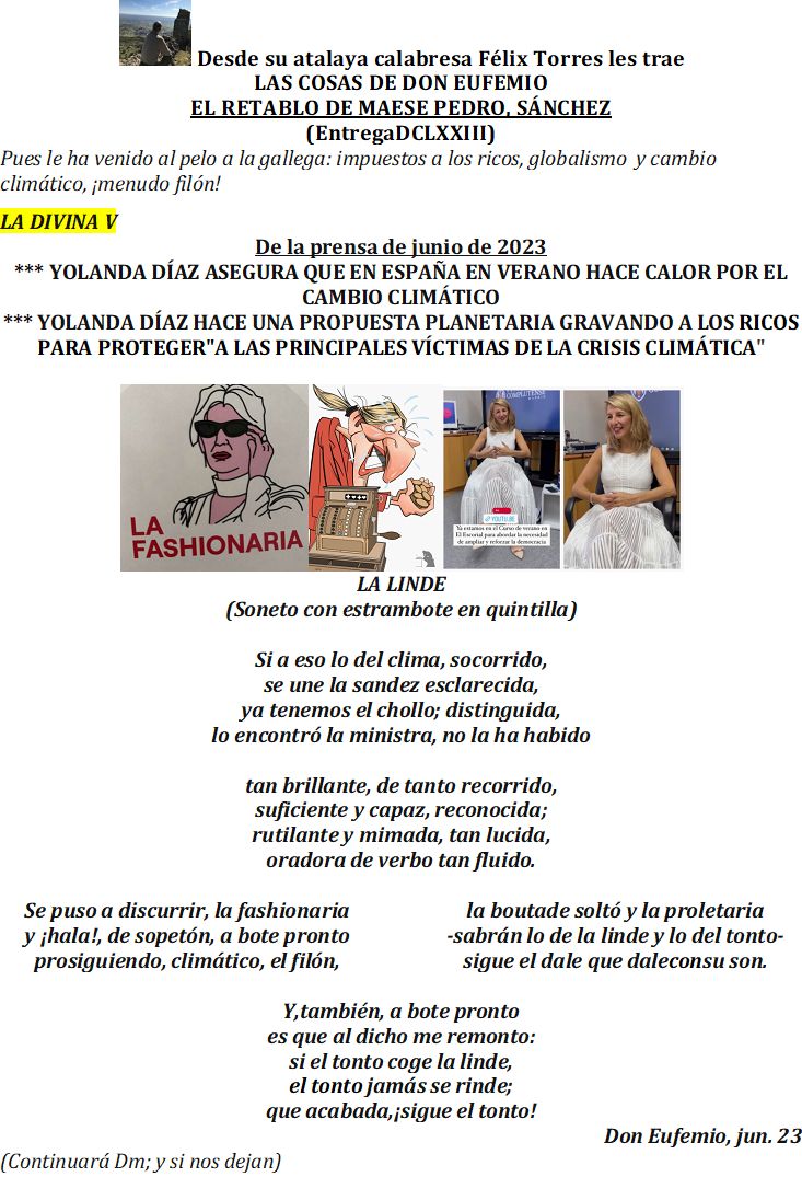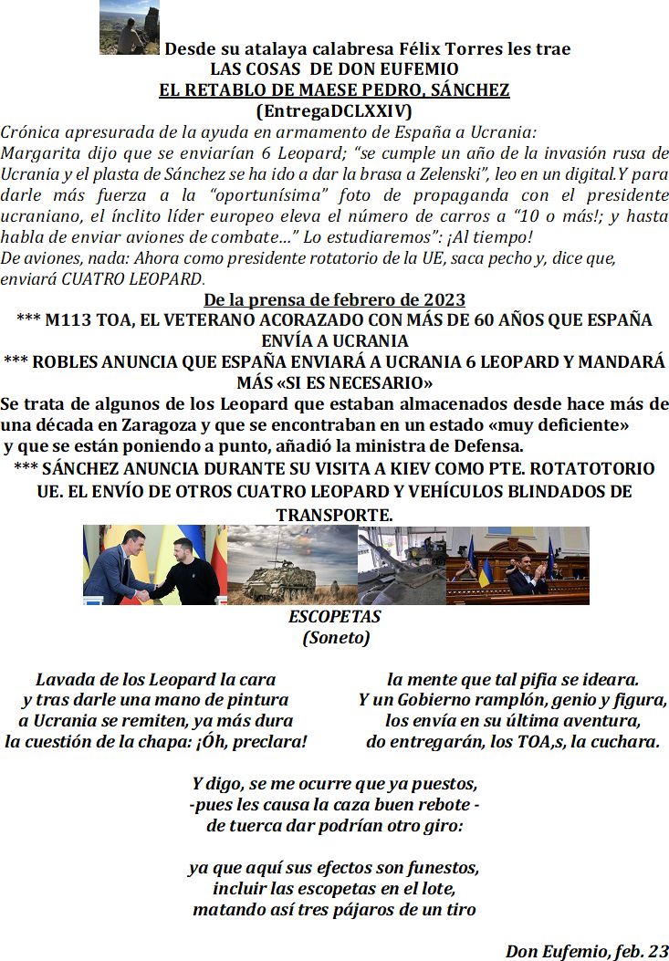 Debido al calenturiento calentón global, los Leopardos se han quedado en tanquetas Fiat-Ansaldo, que los de la Moncloa quieren que suenen como música celestial de Abarth, aunque la verdad es que lo hacen como pedos infernales del demonio, y huelen aún peor, con lo que los veinte mil euros los gastaremos en juveniles ambientadores, a los que el Sánchez dotará de una direccción general y de los directores generales, por méritos propios (cuñaos y similares asimilados), que hagan menester para resaltar sus narcicistas aires de importancia. Buenos días, don Eufemio, y todos, y alegrémosnos de que esto NO sea un gobierno ni nada parecido, porque si no, seríamos el hazmereir de la «Unión» Europea, otros que tal; por cierto.
