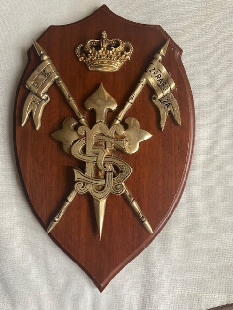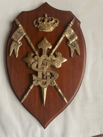Bajo Corona Real, lanzas de Caballería, en sus banderolas siglas de la Unidad. C.R.E. (Centro de Reproducción Equina), y la ciudad donde se ubica: Zaragoza. Donde las lanzas se juntan, Cruz de Santiago, Patrón de España y del Arma, y en su interior, S.E. (Sementales del Estado), el hierro de nuestros caballos.