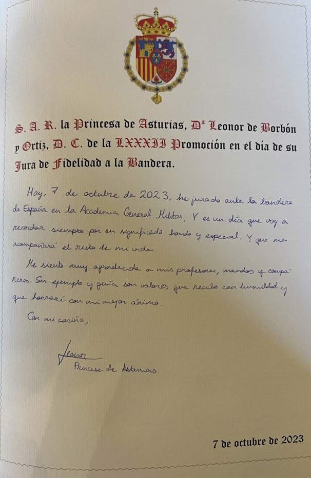 El 17 de agosto de 2023, la Princesa de Asturias se presentó en la Academia General Militar, como una más de los aspirantes a las pruebas de ingreso. Estampó su firma en el libro de visitas, acompañada de sus padres y hermana, con una blusa de Zara y calzado deportivo.