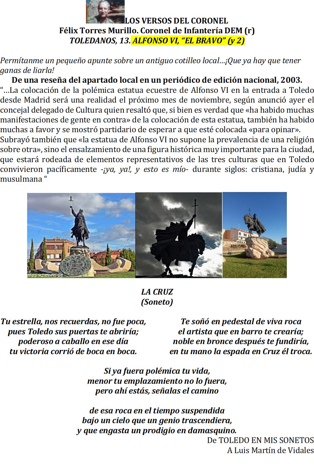 Seguramente en Toledo, como en cualquier otro lugar de España, hay eruditos de nuevo cuño, de esos que nunca fueron a la escuela, que pensaron que el libertador de la muy antigua, muy leal, noble, heroica y celebérrima ciudad, montando un brioso caballo y portando con orgullo una espada vencedora con una cruz por guardamanos, pensaron que se trataba de otra estatua ecuestre de Franco disfrazado de rey cristiano, y por eso estaban dispuestos a montar un número.