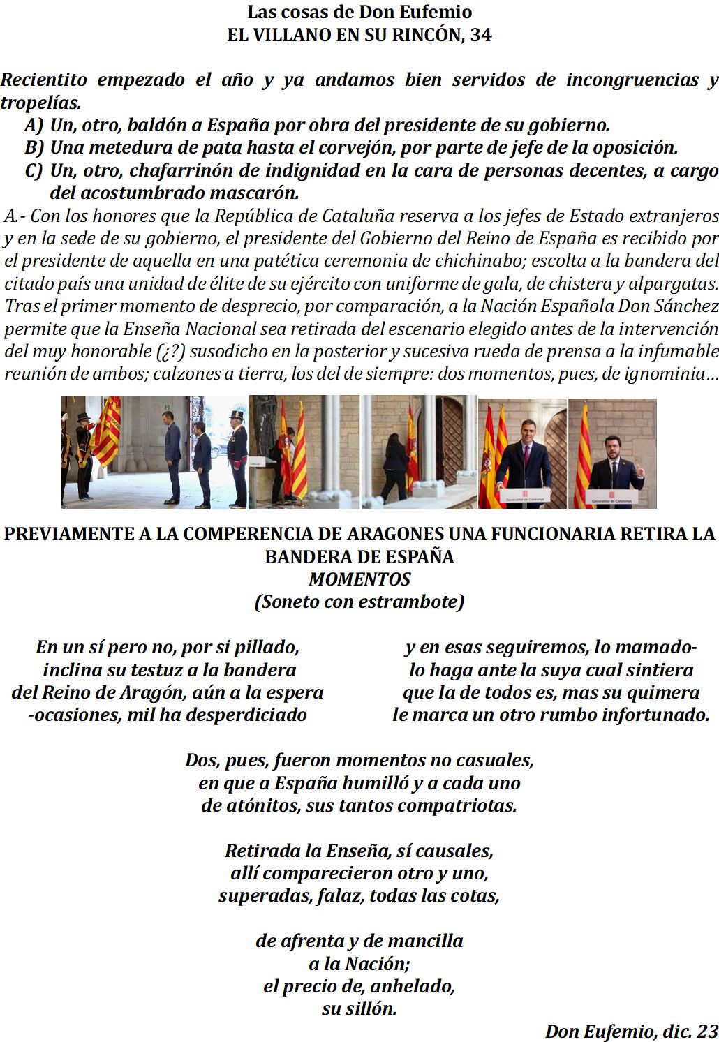 En cuanto a la retirada de la bandera española durante la visita de Sánchez (a quien se recibe como si fuera un gobernante extranjero) a Aragonés, pues la conclusión es obvia: el verdadero problema de España no es Bildu, ni ERC, ni Junts per Catalunya. El verdadero problema de España se llama PSOE.