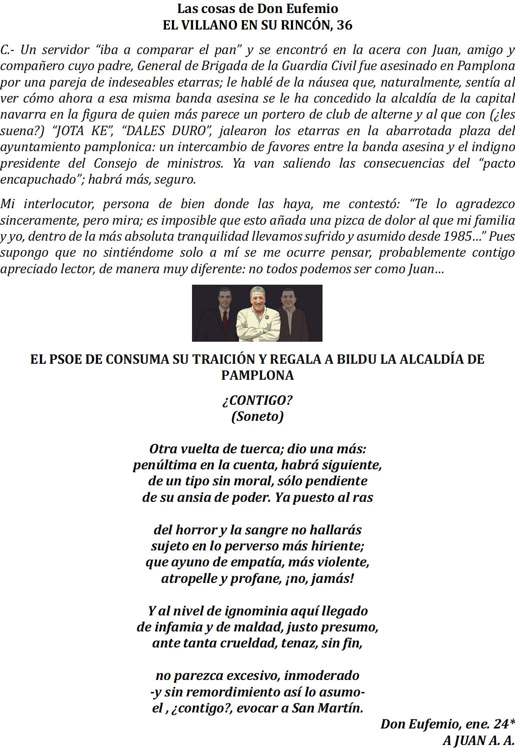 Respecto al regalo de la alcaldía de Pamplona a Bildu, como ya comenté en el artículo del general Castro Zotano, el día 28 de diciembre yo estuve en la manifestación constitucionalista para defender una Navarra separada de las Vascongadas y ESPAÑOLA.