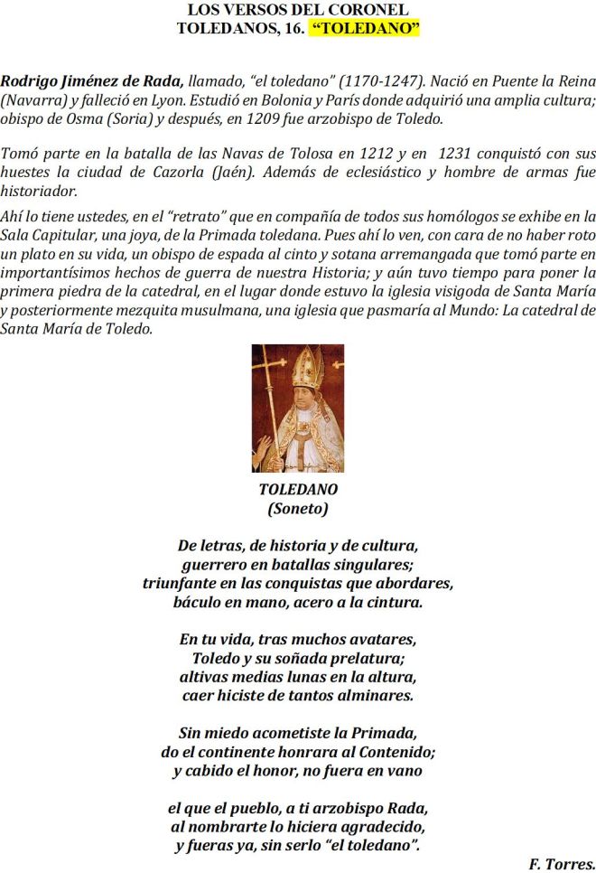Sobresaliente sobre Dn.Rodrigo Jiménez de Rada, me recuerda mucho al Papa Julio, con sus luchas al frente de su ejército, queriendo ver acabada la capilla Sixtina de Miguel Angel. Los derechos humanos con este «desgobierno» brillan por su ausencia, así que aquel desastre de los independentistas parece que va a quedar sin castigo. En cuanto a la cara que puso el «okupa» de piel fina, cuando le tumbaron la ley, eso era más que un poema, pensando en otra barbaridad. Los independentistas lo tienen más claro que el de la piel «fina», quieren no pagar las consecuencias del desaguisado, que se le condonen las deudas y la independencia. Ahí, es na. Muchas gracias Mi Coronel y Saludos para todos.