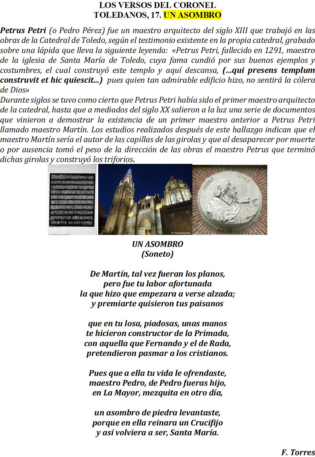 «Petrus Petri, fallecido en 1291, maestro de la iglesia de Santa María de Toledo, cuya fama cundió por sus buenos ejemplos y costumbres, el cual construyó este templo y aquí descansa, pues quien tan admirable edificio hizo, no sentirá la cólera de Dios»