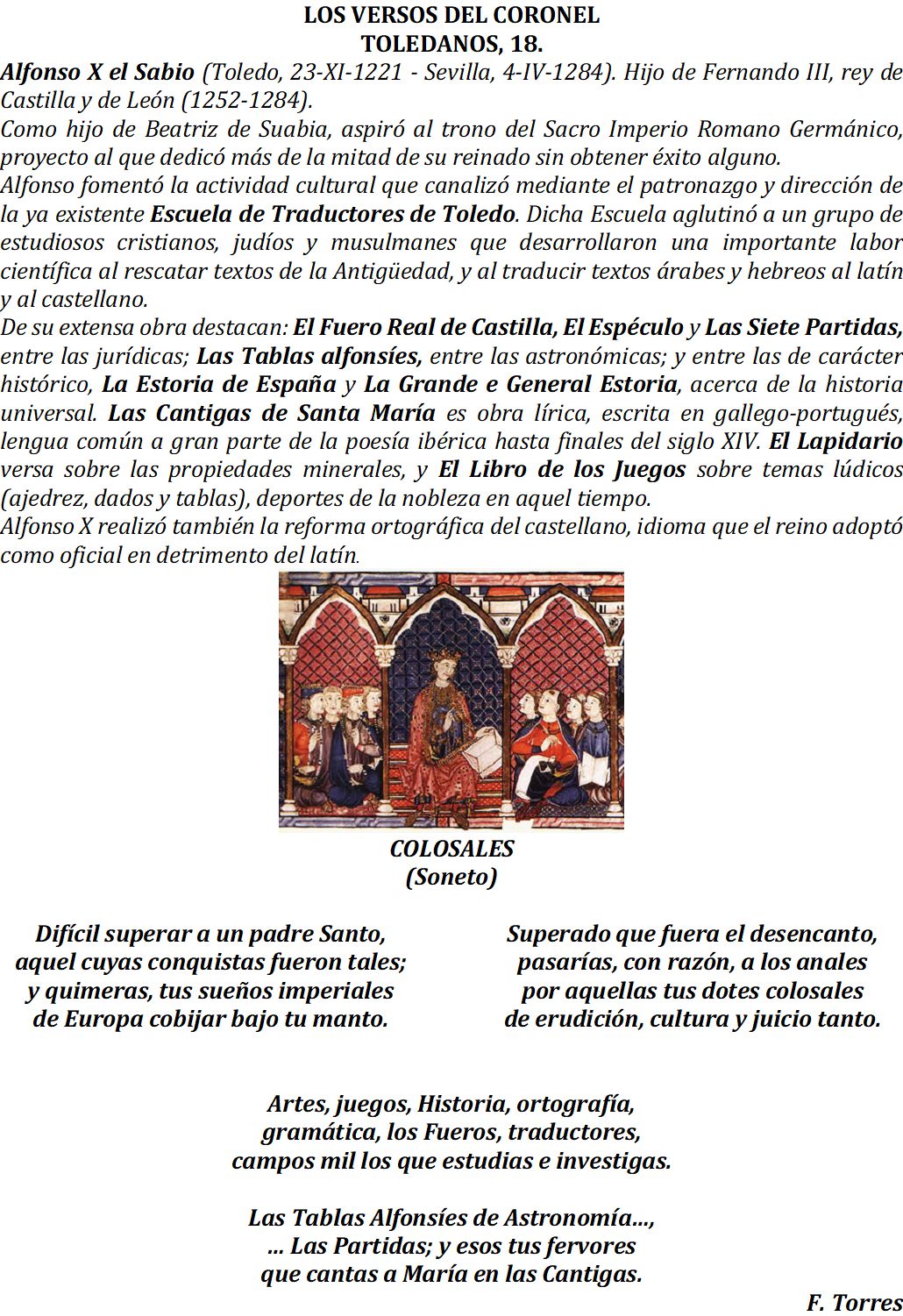 Como siempre, muchas gracias Mi Coronel, por refrescarnos la historia de Alfonso X El Sabio. Ahora estamos en medio de tinieblas, no sabes por donde vas, ni dónde nos quieren llevar, estoy perdiendo la ilusión por los políticos. En cuanto al asesinato de los dos números de la Benemérita, no tienen conciencia, a veces pienso, para que llevan armas, si no les dejan usarlas, parece que les llevan como a los corderos al matadero. Con todo esto, ¿Qué esperanzas hay? Son muchas cosas muy mal hechas. En consecuencia quien tiene poder, lo utiliza para su propio beneficio, los demás poco o nada podemos hacer. Saludos para todos.