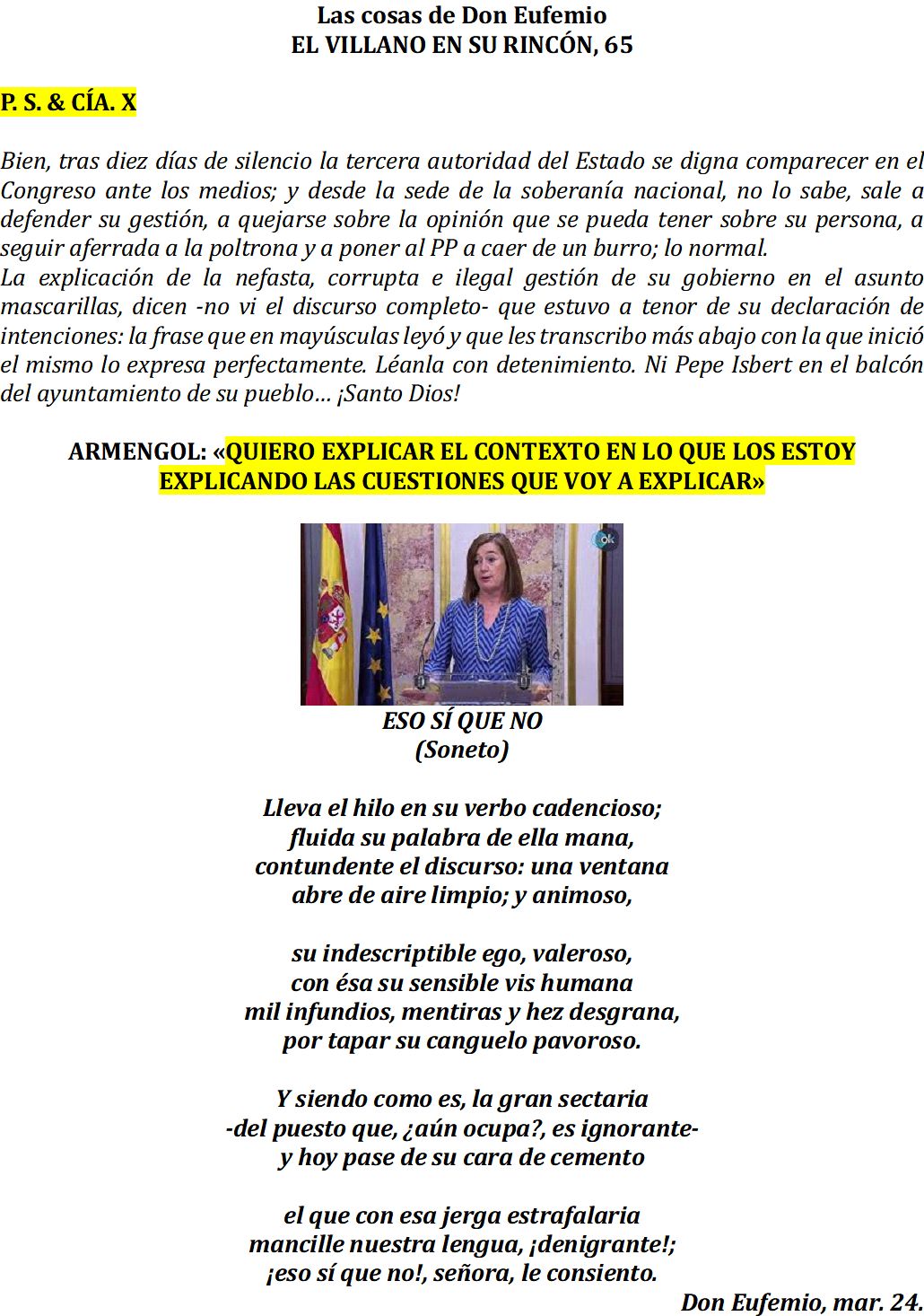 5. Muchas gracias Mi Coronel. Aquí hay estopa para todos pues merecen eso y mucho más, desde la amnistía, hasta los koldos, tito Berni, Armengol, sin dejarnos atrás a la mujer del presidente. Esto huele a podrido, es de un subido tan grande que no se como nos asfixiamos con tanta podredumbre por parte de los políticos, que encima tienen la piel tan fina, que ni soportan salir en las fallas. Estoy cansada de tanto «buenismo», ¡hasta cuando! . Me he hecho un propósito de nunca perder la fé, pero a veces se flaquea. Saludos para todos.