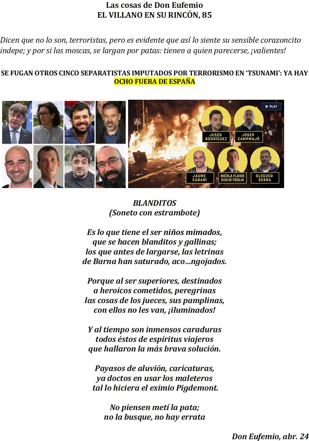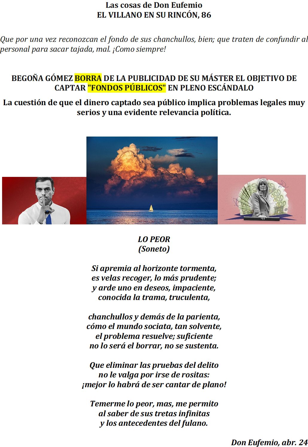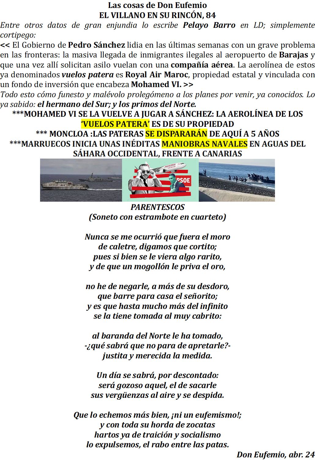 Muchas gracias Mi Coronel, que con sus sonetos dice tantas verdades. Lo de Marruecos no tiene nombre. ¡Que habrá pasado para que se le consienta tanto! ¿Será para tapar las vergüenzas de Begoña o algo más? La cuestión es que aquí vienen un montón y encima hay que cuidarles, yo no soy racista, pero me gusta la justicia y aquí no la veo por ninguna parte. Se nos va de Tour por todas las naciones para que se reconozca Palestina, y a los ciudadanos nos deja a nuestro aire. El está haciéndose la cama para cuando se vaya del gobierno tener otro chiringuito, pues hay que reconocer que le gusta «presumir» aunque solo sea de traje. Saludos para todos.
