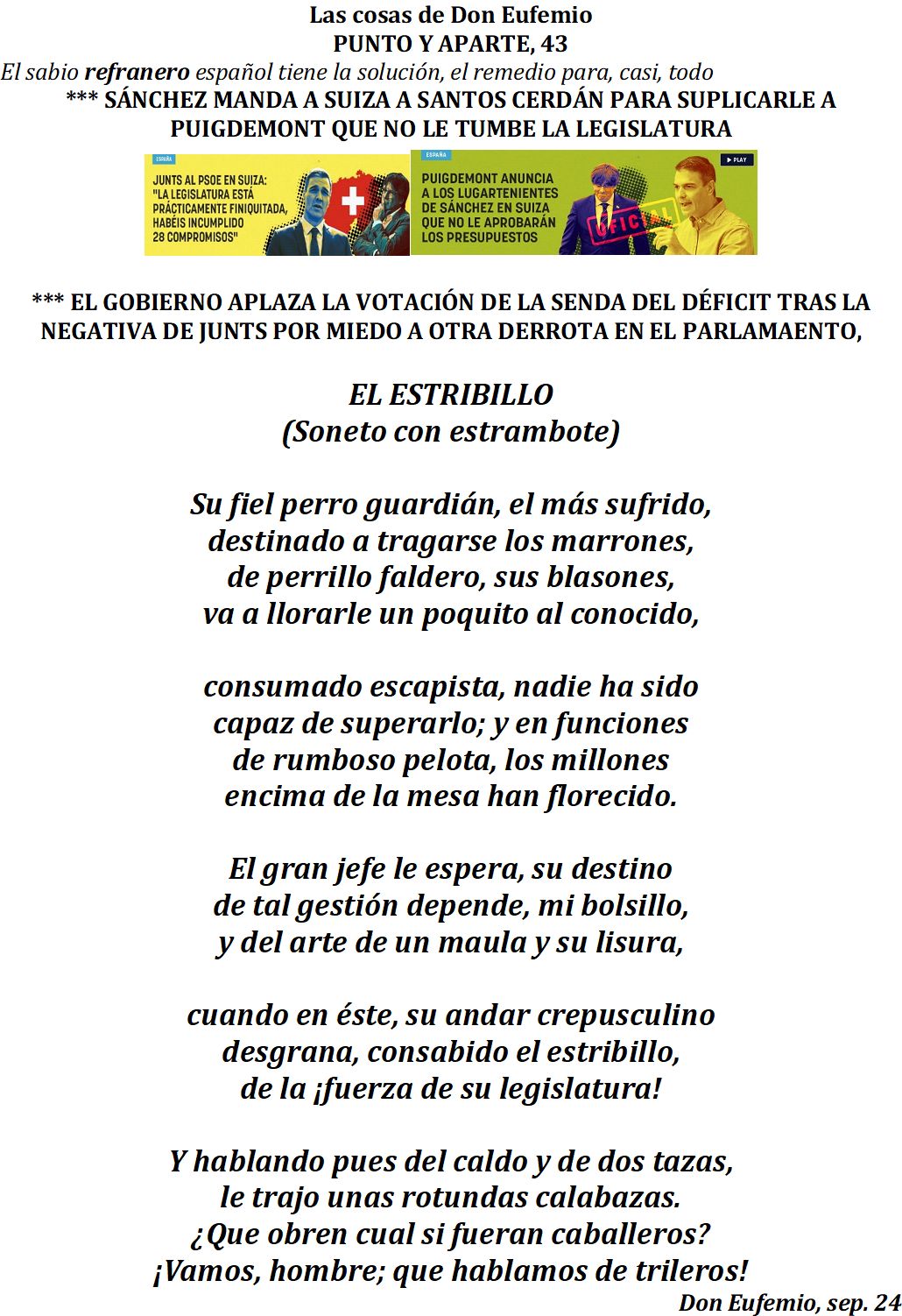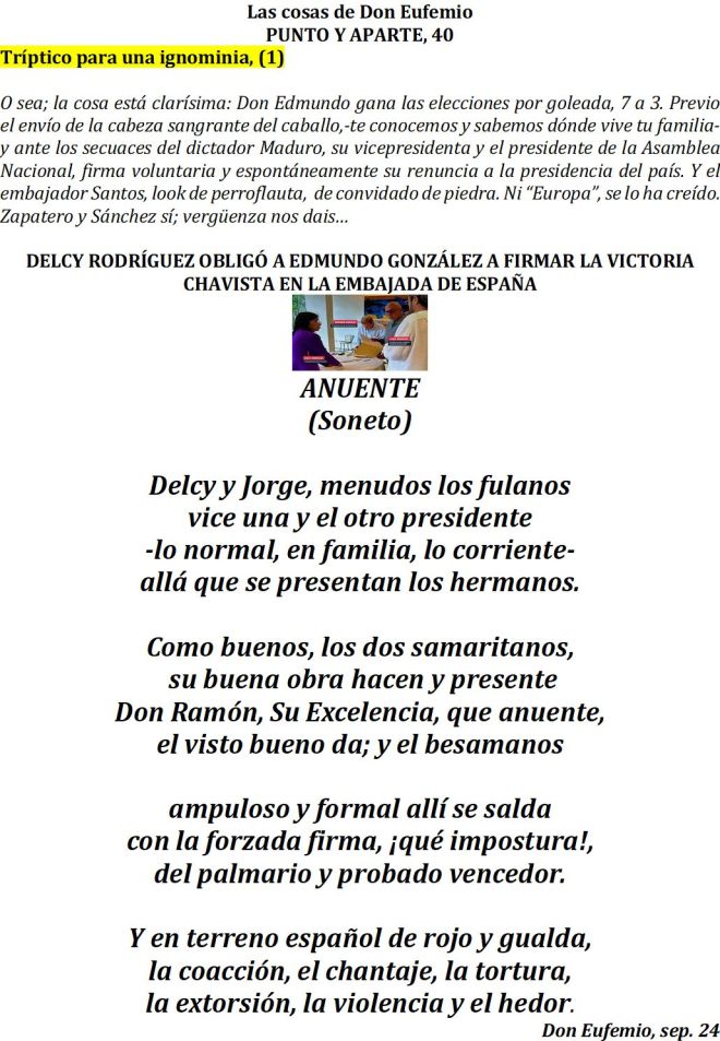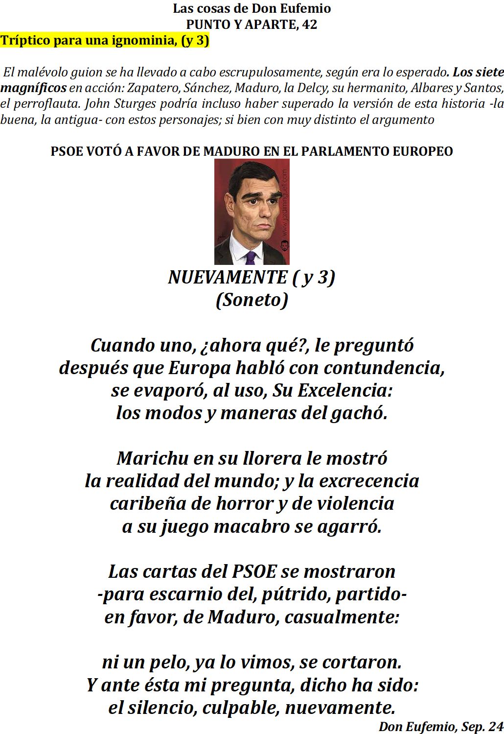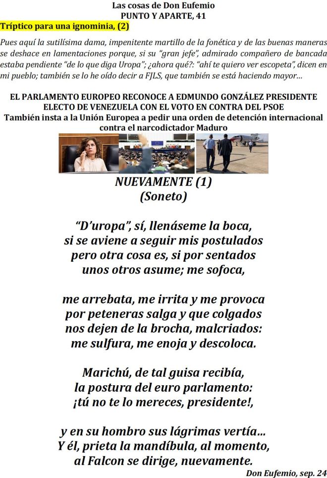 Como siempre Don Eufemio muy grande. Solo una cosa: ¿Qué hizo el Centrocuentismo contra Maduro? Nada. Como en tantas y tantas cosas. Nada. Eso sí, gestionar, gestionan de maravilla. Y ya babeando buscando el apoyo de Junts. ¡¡Que asco dan todos!!