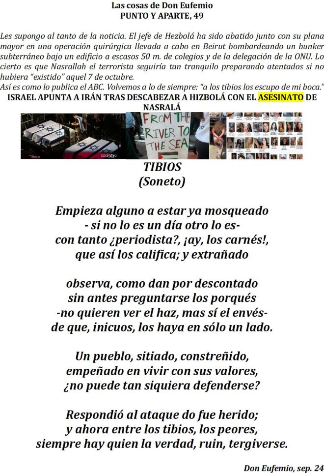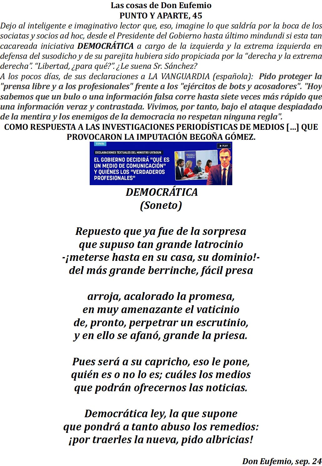 Buenos días, mi Coronel y todos; gracias, otra vez, por estos sonetos mañaneros que ponen en solfa a todos esos; si alguien todavía se pregunta quienes son «todos esos», les diré que no son CASI nada bueno, el casi, porque lo único que tienen de bueno, es que sus fechorías RIMAN con cualquier cosa que escriba y describa un hábil rapsoda como don Eufemio. Caen en verso aquí, en el blog todos los sábados, CAEN GORDOS, donde quiera vayan, si es que van a algún lado, a todo el mundo, el resto de los días y horas del año.
