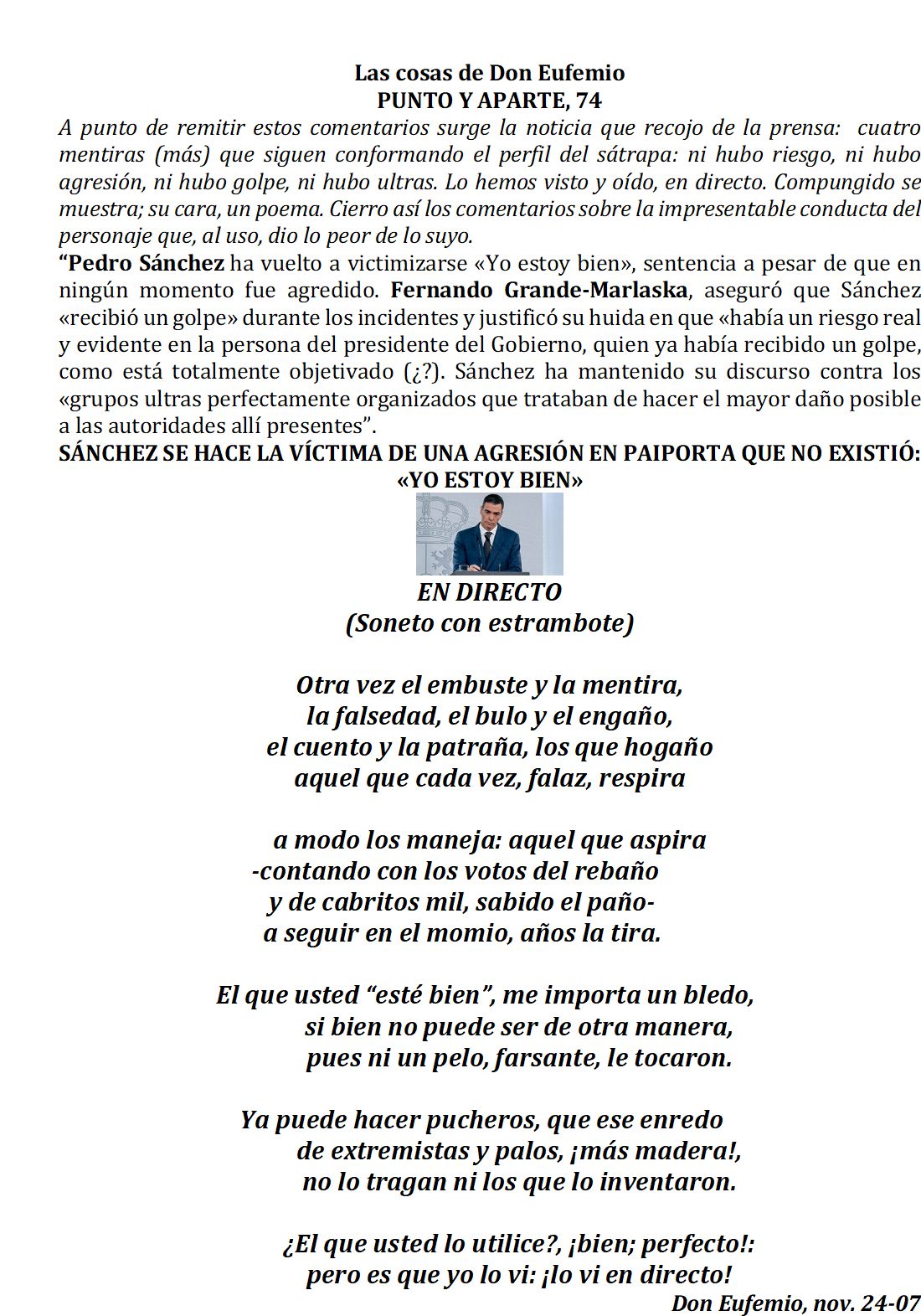 Mi Coronel. Parece mentira que la gente se crea todas sus mentiras y su victimismo, que está practicando desde que entró por la puerta de atrás de presidente. Nunca ha ganado unas elecciones, lo único que sabe hacer, es despedazar a España, y pactar con terroristas e independentistas, para mantenerse en el sillón, y ayudar en sus chiringuitos a su esposa y familia. En cuanto a los reyes, se comportaron como lo que son, como los padres que ven a sus hijos desesperados, escuchándolos y consolándoles, más no pueden hacer, porque no se que demonios hicieron en esta constitución que no pueden decidir por su cuenta, sin no el «okupa». Muchas gracias por sus amenos sonetos y saludos para todos.