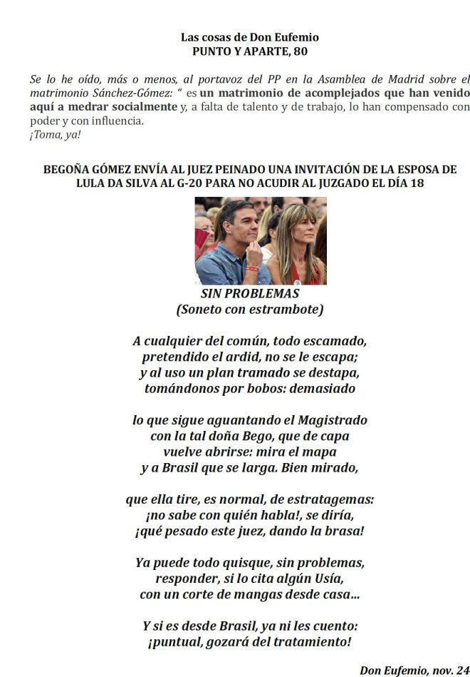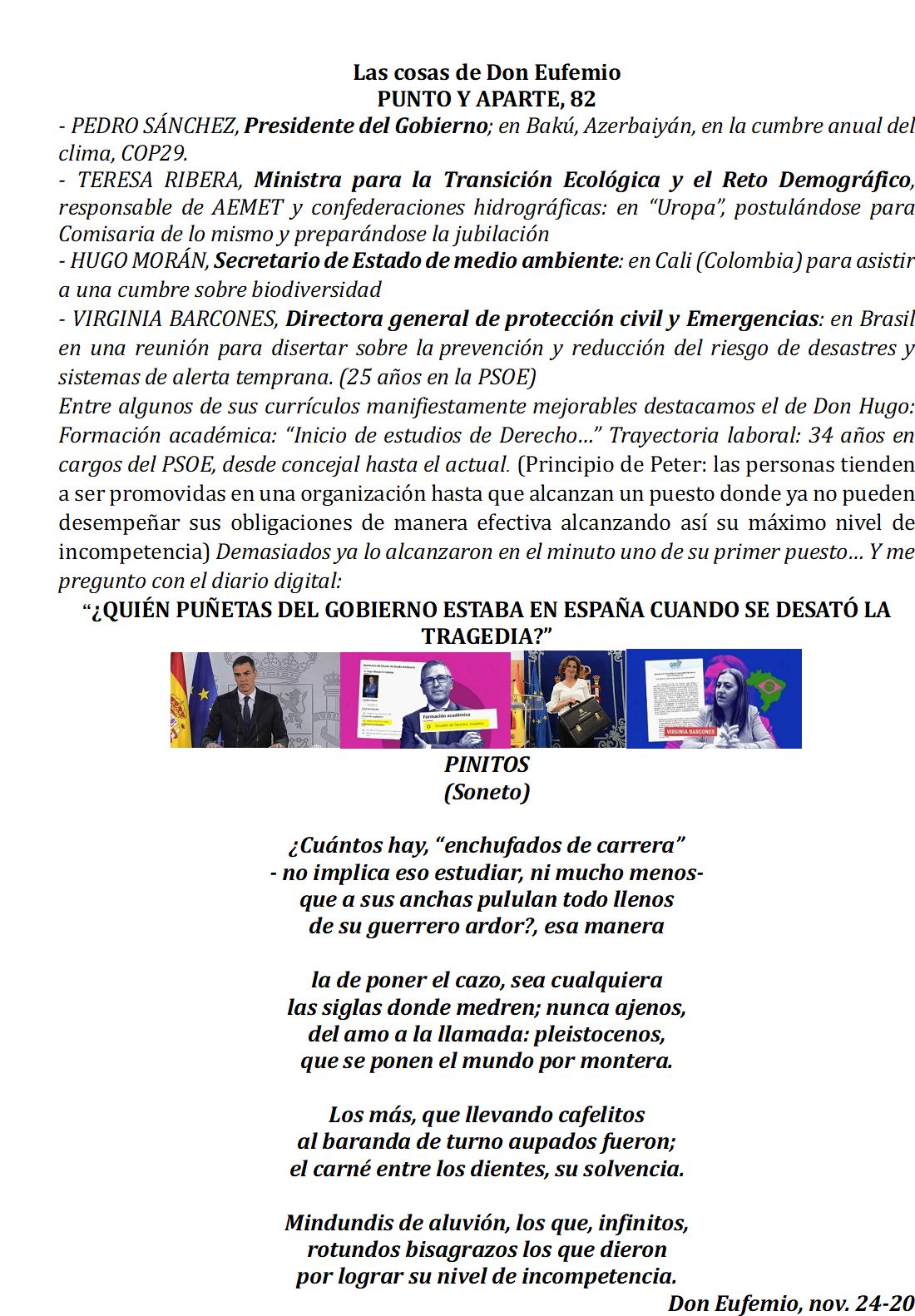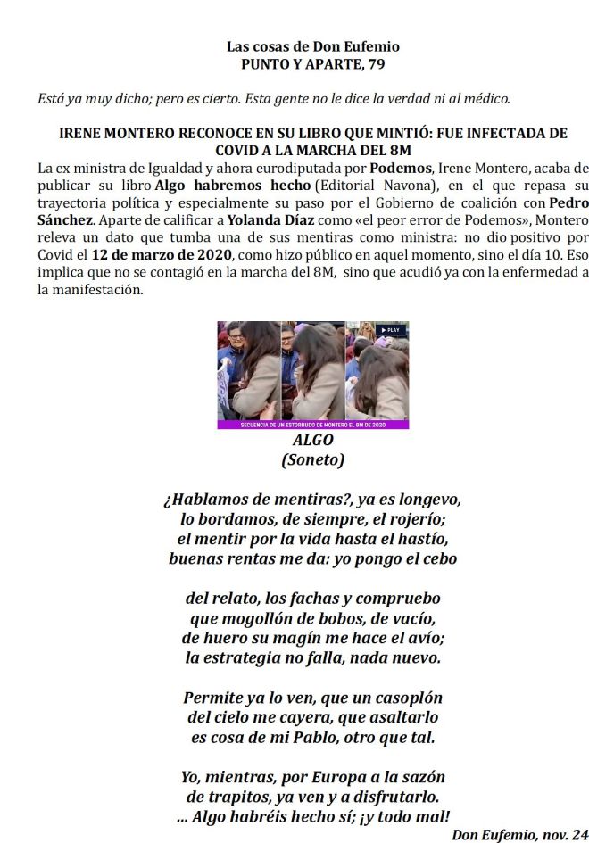 2. ¡Que razón tiene Mi Coronel con todos sus comentarios y sonetos!. La Montero con el covid, mintió, como es natural en todos ellos y menudo casoplón se han mercado los podemitas y ahora en la Eurocámara, para no hacer nada positivo. La oposición, me parece que está dormida. La Bego, con una cara que se la pisa, y así sucesivamente, con todo este panorama, tenemos «desgobierno» para rato, aunque salga las acusaciones de Aldama.Gracias y saludos para todos.