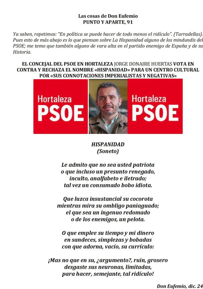 T1: A personas como EL JORGE DONAIRE igual que al MONCLOVITA, NI P…. CASO. Son tal cual. El monclovita será mejor llamarle nieto del CARNICERO (apodo puesto por sus legis). AL de imperialistas y negativos igual ya que por esas bocas solo sale MALDAD. Acertado, como siempre el SONETO «HISPANIDAD».