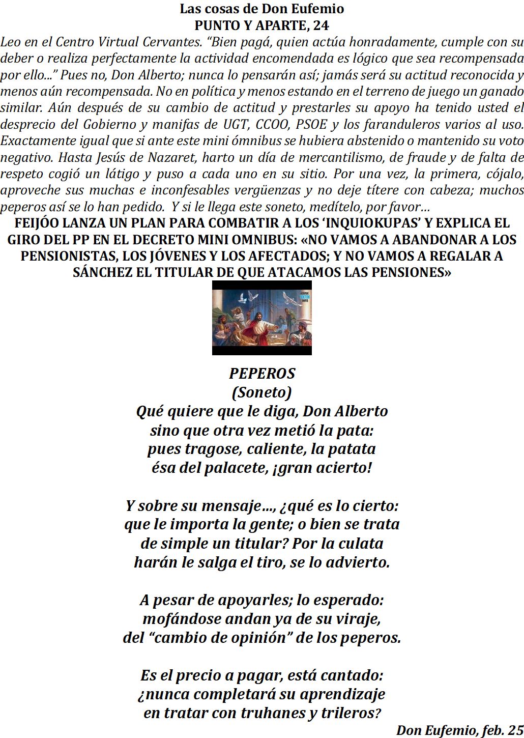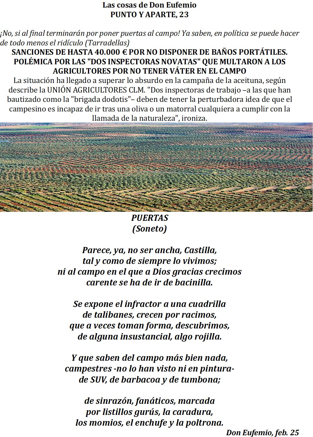 Buenos días, mi Coronel, don Eufemio, querido Tocayo, y a todos los demás, que aquí ninguno sobra si echamos a todos esos que sobran; que si a la hora de apuntar, a todo un campo no son capaces de atinar, menos acertarán, intentando la suerte en el portátil orinal, más diminuto que un Berni-Lupanar.