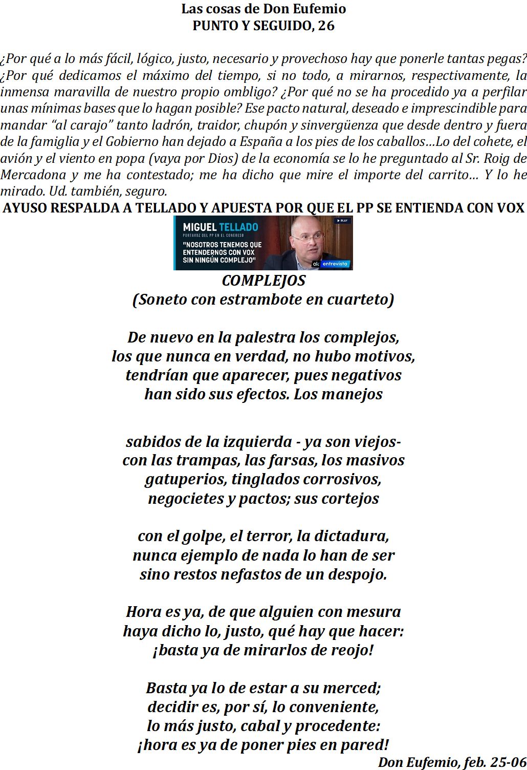 ¡Cuantas cosas mal hechas está haciendo este «desgobierno», con el «okupa» a la cabeza! Lo de los váteres es de traca, y me pregunto ¿también les van a obligar a los animalitos?. hay que reírse por no llorar, en cuanto al cohete, se los pondría yo a todo este «desgobierno» para que aterricen en algún planeta desconocido. Al sr. Núñez Feijoo, no le entiendo, hace unas cosas que para mi humilde entender no están muy claras, o dentro o fuera. Sobre el Sr. Tellado y la presidenta Díaz Ayuso, estoy totalmente de acuerdo, que se unan con Vox y que no se fíen de los «zurdos». Veo que el PP, tienen personas muy brillantes y no les dan el sitio que les corresponde, como a Cayetana Álvarez de Toledo, para mí, vale mucho más que Núñez Feijjó. Lo del sr. Roig, es totalmente cierto, sólo con la cesta de la compra te das cuenta de la verdad de lo que hay, suben un poco las pensiones, pera da igual, si suben mucho más los impuestos, quieren con un dedo tapar el Sol. Son unos impresentables. y encima a aguantarles. Muchas gracias Mi Coronel y saludos para todos.