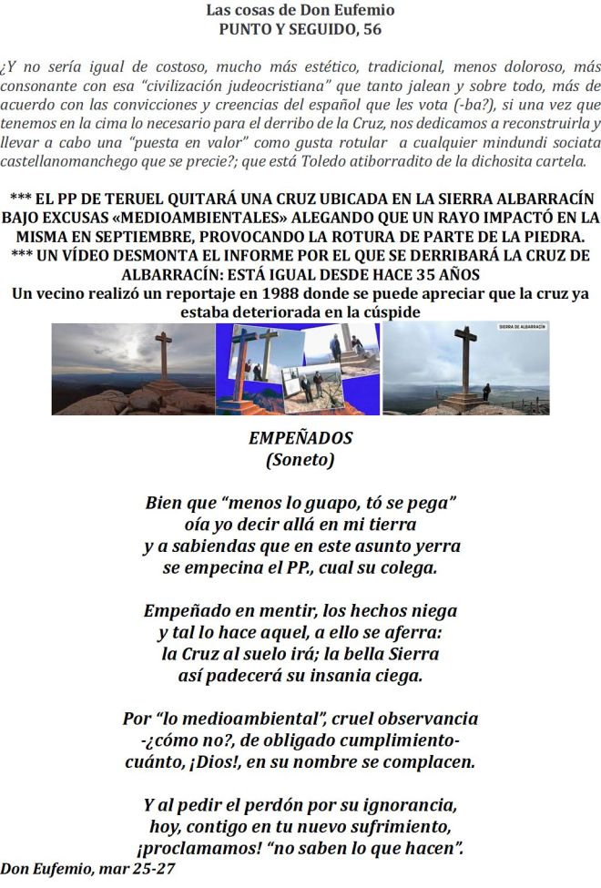 Muchas gracias Mi Coronel. Sobre los menas, no entiendo porqué no se devuelven a los marroquíes, ya que allí no tienen guerras, y encima nos hacen de todo, los otros es diferente, pero el reparto es clasista, parece que estamos jugando a los cromos.Sobre la cruz de Albarracín, le comentaré que como aragonesa que soy, me está sentando muy mal de que se restauren cosas que no valen nada y la cruz que es nuestro distintivo de nuestra cultura cristiana no lo puedan restauran y quitarla, a veces pienso en los políticos que parecen todos lo mismo y para tener contentos a los zurdos y musulmanes se nos quieren cargar nuestra cultura. Saludos para todos.