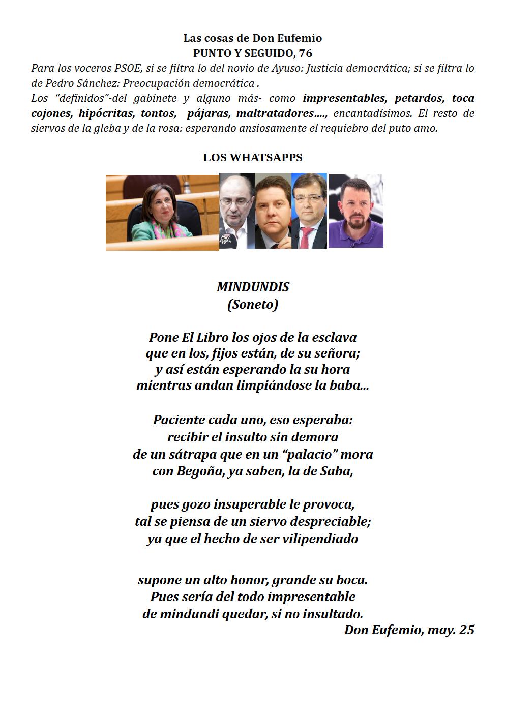 Gracias Mi Coronel. Siempre tan certero en sus escritos y sonetos. Con tal que se les nombre, toda la corte del «faraón», contenta, aunque sean insultos, es imposible intentar entender lo que ocurre entre ellos. La visita a Roma para ver al papa en su entronización, fué de traca, el «okupa», no aparece, la «chiqui», no siguiendo el protocolo, la fashionaria como siempre, su mirada en la nubes, Bolaños, el añadido y Feijoo sin espabilarse. Menos mal que estaban los reyes. Y lo del hermanísimo, es de vergüenza, tanto por su enchufe, como lo que se ha hecho en Extremadura, para ser aforado el individuo que le enchufo…….. Me quedo sin palabras. En cualquier país, dimiten en un pis pas, aquí no se mueve nadie, parece ser que están como si fuese uno con el sillón. Saludos para todos.