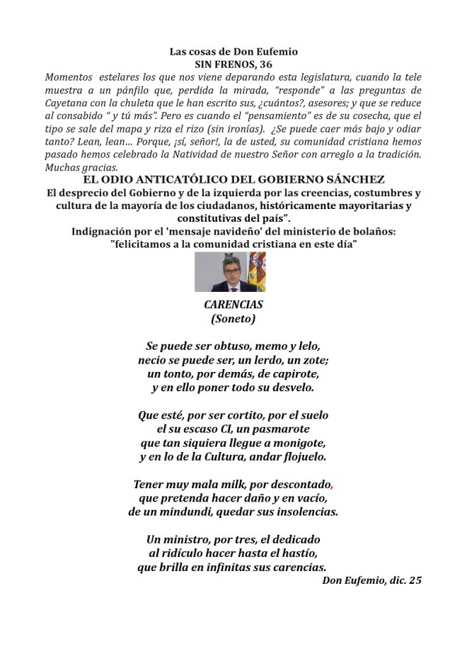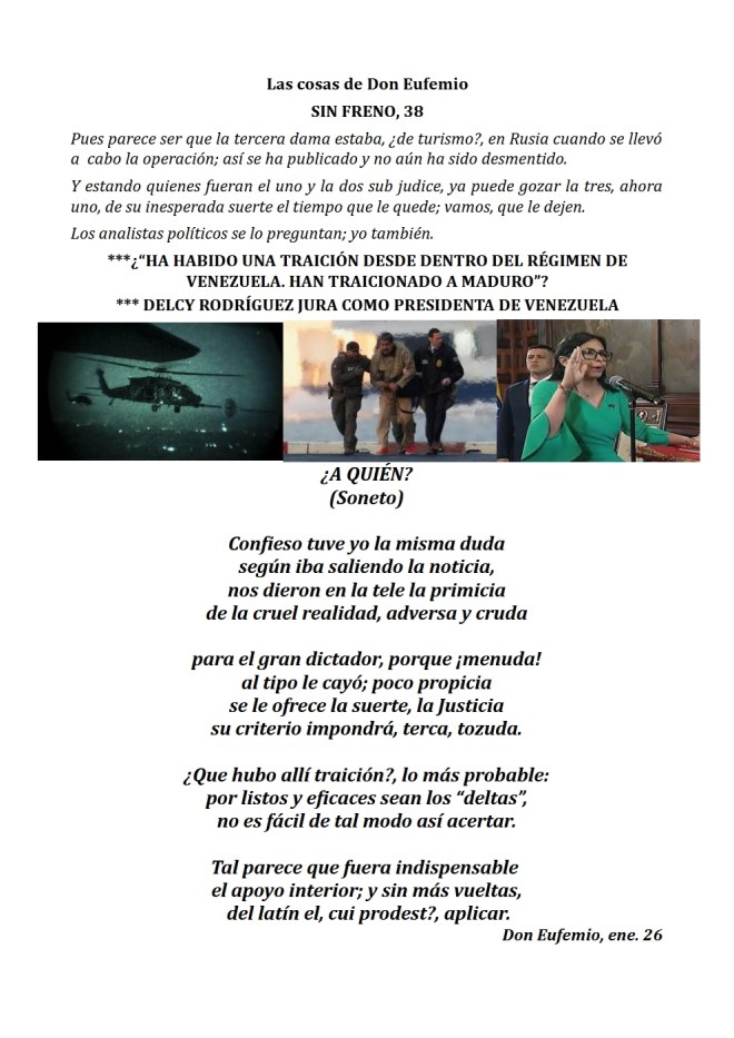 Buenos días y muchas gracias Mi Coronel. De Bolaños, yo diría que está de tonto para arriba, y Cayetana le dá cada repaso que ni aún así se entera, su mala voluntad y maldad por la felicitación Navideña, se sale ya de tono. Sobre Venezuela, a mi modesto entender, «alguien hubo por allí que le facilitó el camino para el secuestro». En cuanto de poner de presidenta a la «mona», sin ofender, pero es lo más parecido a un simio, sigo sin entenderlo. Del «okupa», se puede esperar siempre lo peor, se quiere convertir en el adalid de la «zuda» y no para de cometer errores, los cuales los pagamos los ciudadanos de a pié. Saludos para todos. y un VIVA ESPAÑA LIBRE DE ALIMAÑAS.