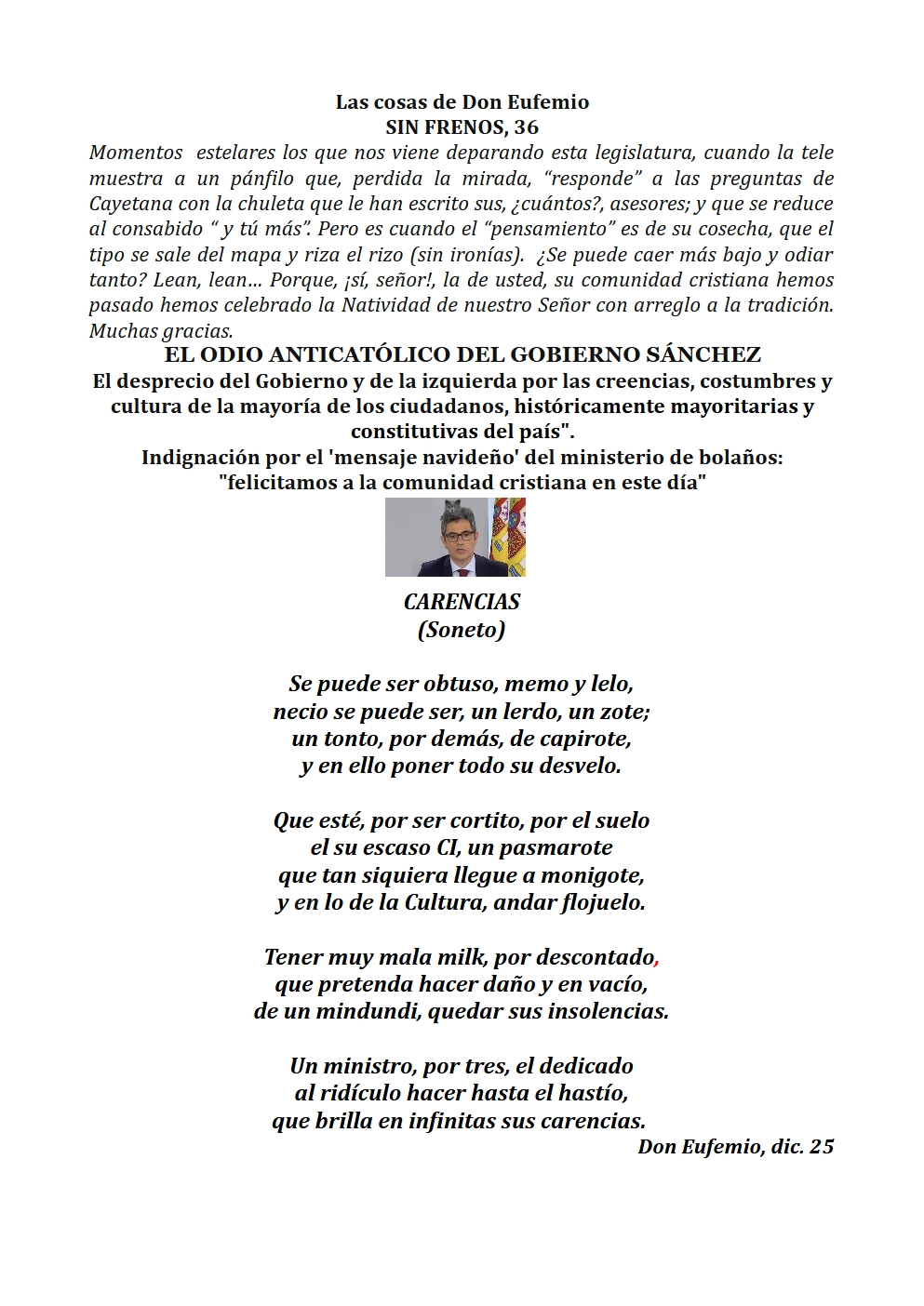 Buenos días y muchas gracias Mi Coronel. De Bolaños, yo diría que está de tonto para arriba, y Cayetana le dá cada repaso que ni aún así se entera, su mala voluntad y maldad por la felicitación Navideña, se sale ya de tono. Sobre Venezuela, a mi modesto entender, «alguien hubo por allí que le facilitó el camino para el secuestro». En cuanto de poner de presidenta a la «mona», sin ofender, pero es lo más parecido a un simio, sigo sin entenderlo. Del «okupa», se puede esperar siempre lo peor, se quiere convertir en el adalid de la «zuda» y no para de cometer errores, los cuales los pagamos los ciudadanos de a pié. Saludos para todos. y un VIVA ESPAÑA LIBRE DE ALIMAÑAS.