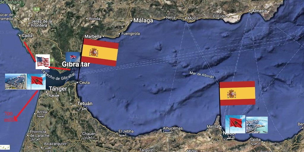 La simple inspección del mapa que les muestro nos deja ver quién manda en el estrecho de Gibraltar y como, poco a poco, o mucho a mucho, nos retiramos del punto débil que España tiene y que militarmente debería ser su gran preocupación. Por lo que se ve otros lo hacen por nosotros.