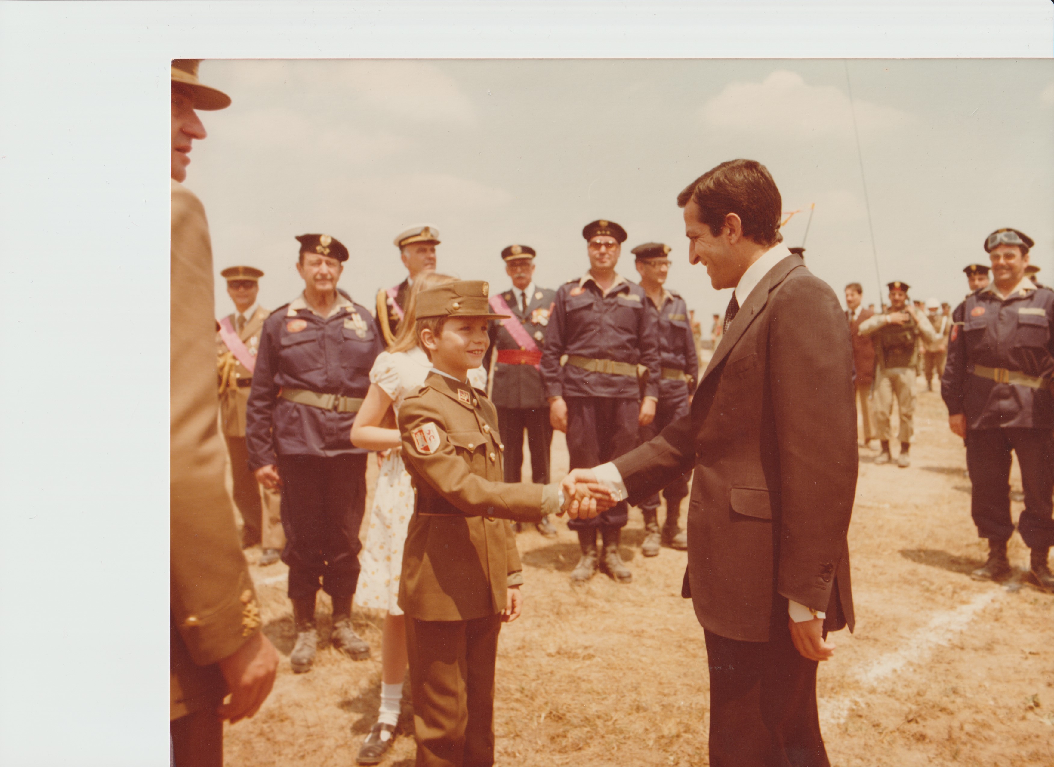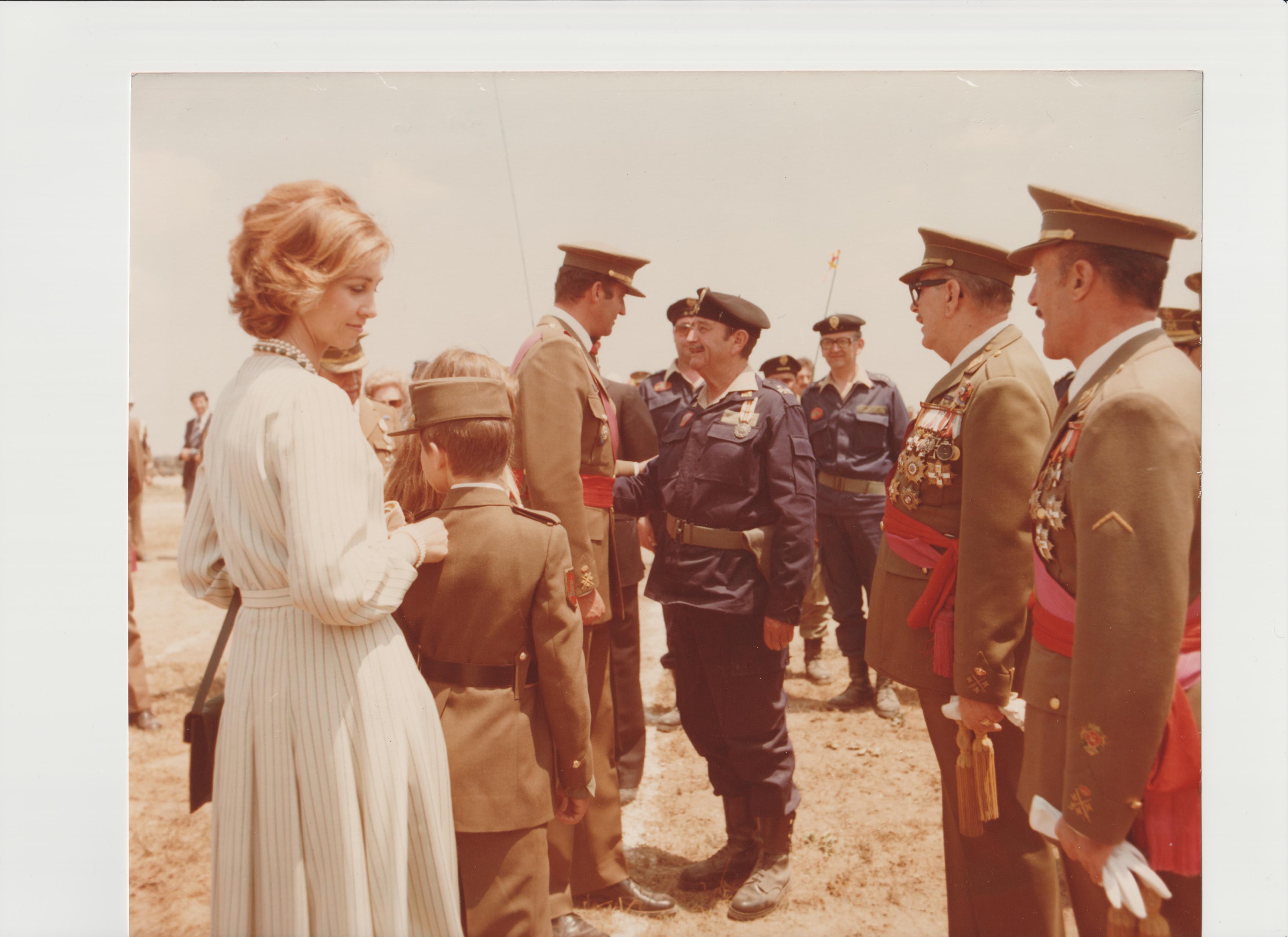 Don Felipe, Príncipe de Asturias, saluda a Adolfo Suárez, Presidente del Gobierno, el día de su filiación como soldado. Al fondo el General Milans del Bosch Jefe de la División Acorazada Brunete.