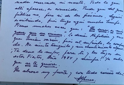 Se acusa él mismo de haber cometido un «error» en una carta que el 6 de enero de 1984 le envía a uno de sus más estrechos colaboradores y amigo durante su periodo junto al Rey. Habla de seguir escribiendo, cosa que luego no hizo y hay que destacar la frase que entrecomilla y subraya: “Un error, es más grave que un crimen»… «al sufrirlo lo comprendo».