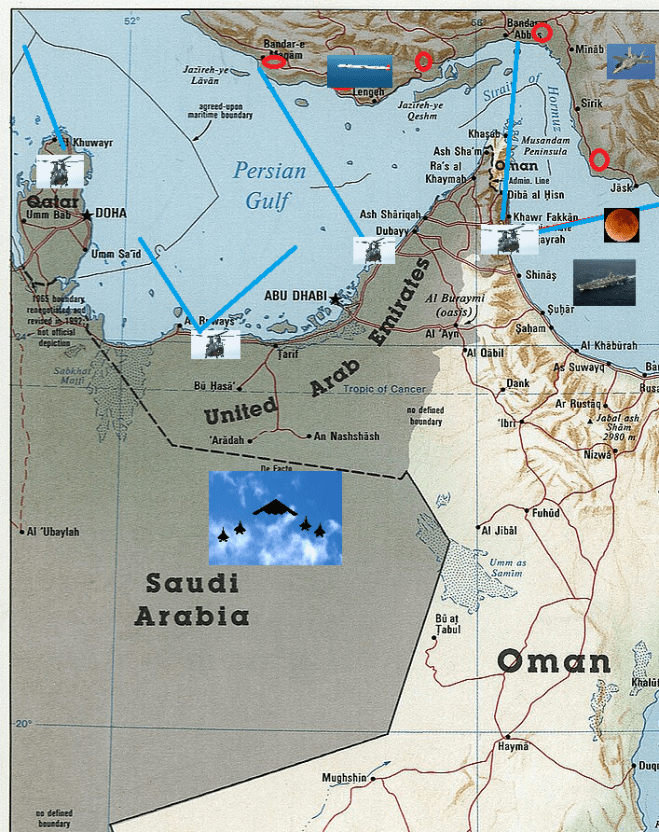 La duración de la hipotética operación será hasta lograr los objetivos. Demolición de toda la defensa de la costa de Irán próxima al Golfo Pérsico. Ocupar militarmente los puertos de Bandar Abbab y Chabahar. Rápido. Desmontar la estructura de Mando y Gobierno iraní y poner la ya pactada. Tomar Jark por medio de una operación especial. Muy segura.