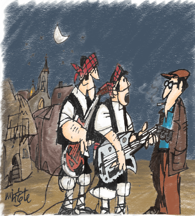 ¿Pasapues maños?…, que nos gustaría ir a Madrid a rondar al Gobierno y cantarles las cuarenta, pero no nos llega el cable. La viñeta y el bocadillo son de D. Ángel Antonio Mingote Barrachina (q.e.p.d.): Dibu-jante, escritor, periodista, miembro de la Real Academia Española (silla r), marqués de Daroca, requeté, antiguo Alférez Provisional y Teniente Coronel Honorífico de In-fantería.