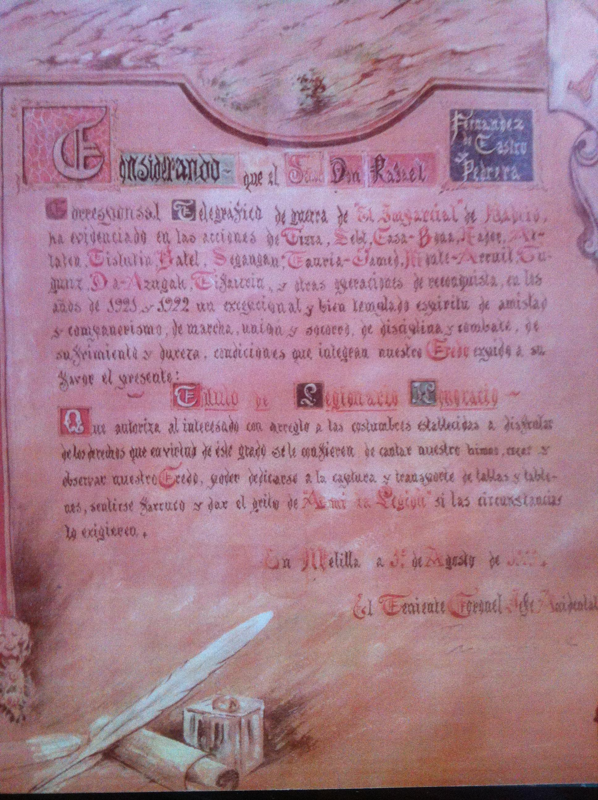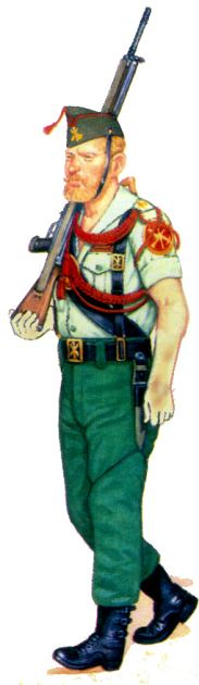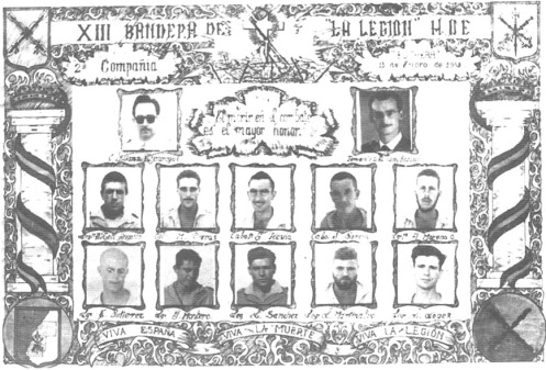 Hubo, de nuevo, que derramar sangre lejos de nuestras fronteras. Volver a teñir la Bandera, la más gloriosa, con sangre legionaria. Era el camino de siempre, el que se señaló el dia de su fundación, el de su Credo, el de sus cien años de existencia. Con sangre firmó su permanencia. Como siempre. Soy valiente y leal legionario. Si en la guerra hallo la muerte, llevaré siempre por sudario, la Bandera Nacional.