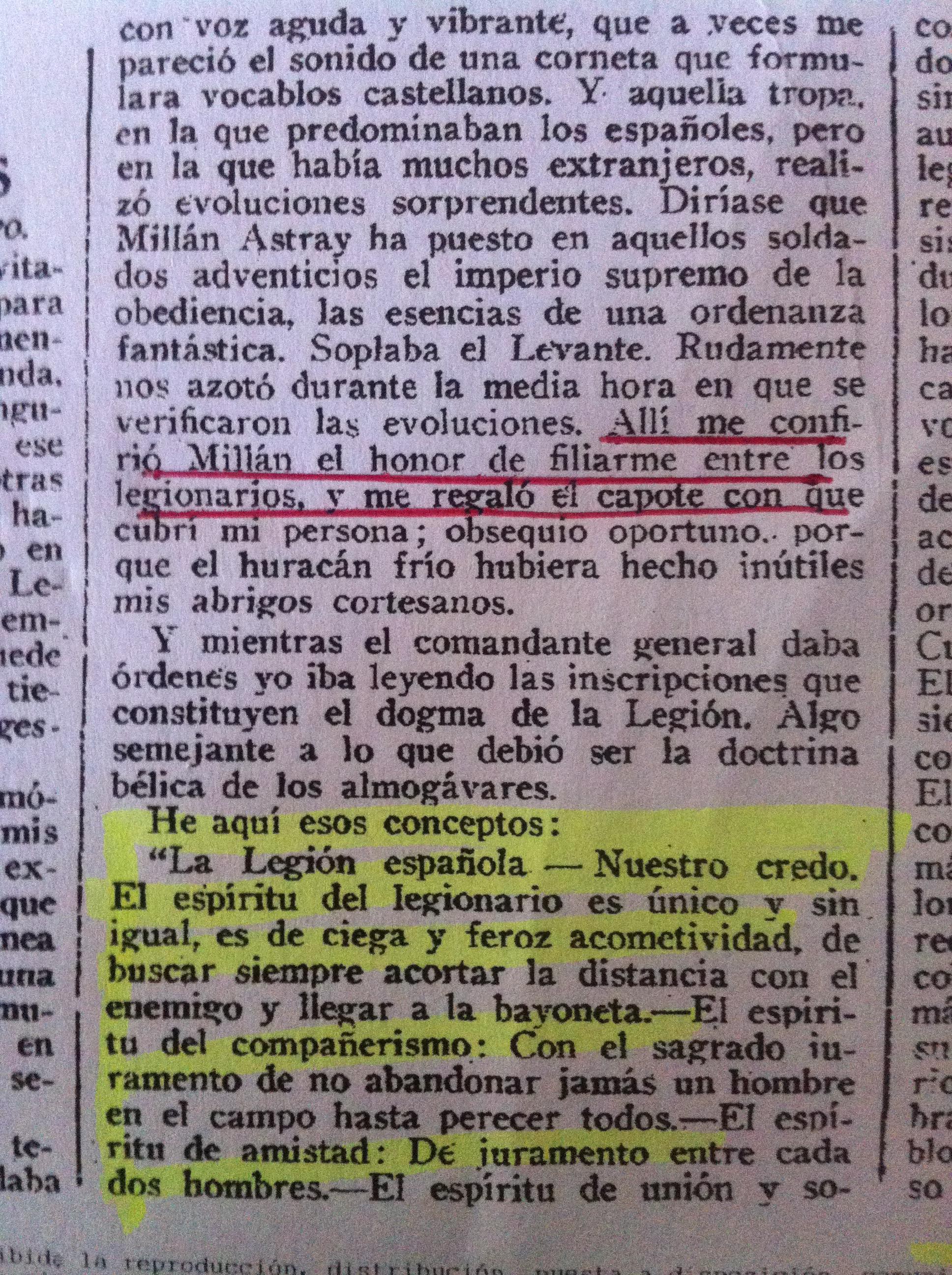 Son palabras del Teniente Coronel Millán-Astray extraídas de su libro “La Legión” escrito en 1923.