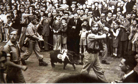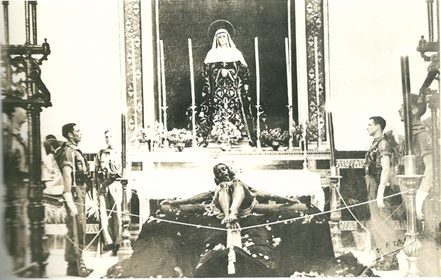 El Coronel Millán-Astray alista a la Legión al Crucificado, Cristo de la Buena Muerte, el Cristo legionario, al que el pueblo empieza a cantar: