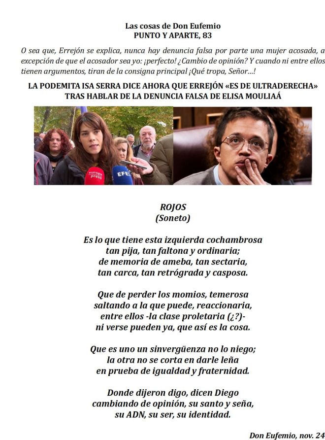 A Yolanda Díaz. Vicepresidenta segunda del Gobierno y líder de hecho de Sumar. «Un poco de seriedad», en su rostro cínicamente siempre sonriente, incluso como ahora intentando tapar el caso Errejón, por usted de sobra conocido, mientras que en la coalición, en Madrid que no en Valencia, se afanan en achicar agua, e intentar una recomposición que, como nadie oculta, será lenta y dura. Y encima, en vez de pedir perdón, muerden. Sus lágrimas en vez de barro, son de cocodrilo. Su feminismo nunca alcanzará grandes metas si solo llena las calles de morado cuando la agresión procede de la derecha. Confiar en su sonrisa , es tan ingenuo y tan peligroso como darle la mano a un pistolero zurdo.