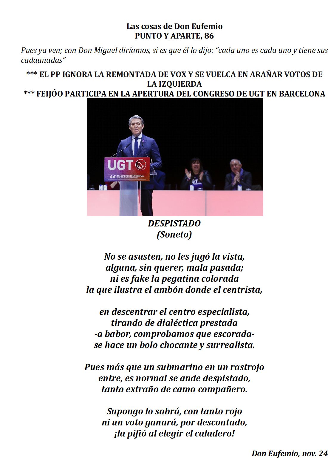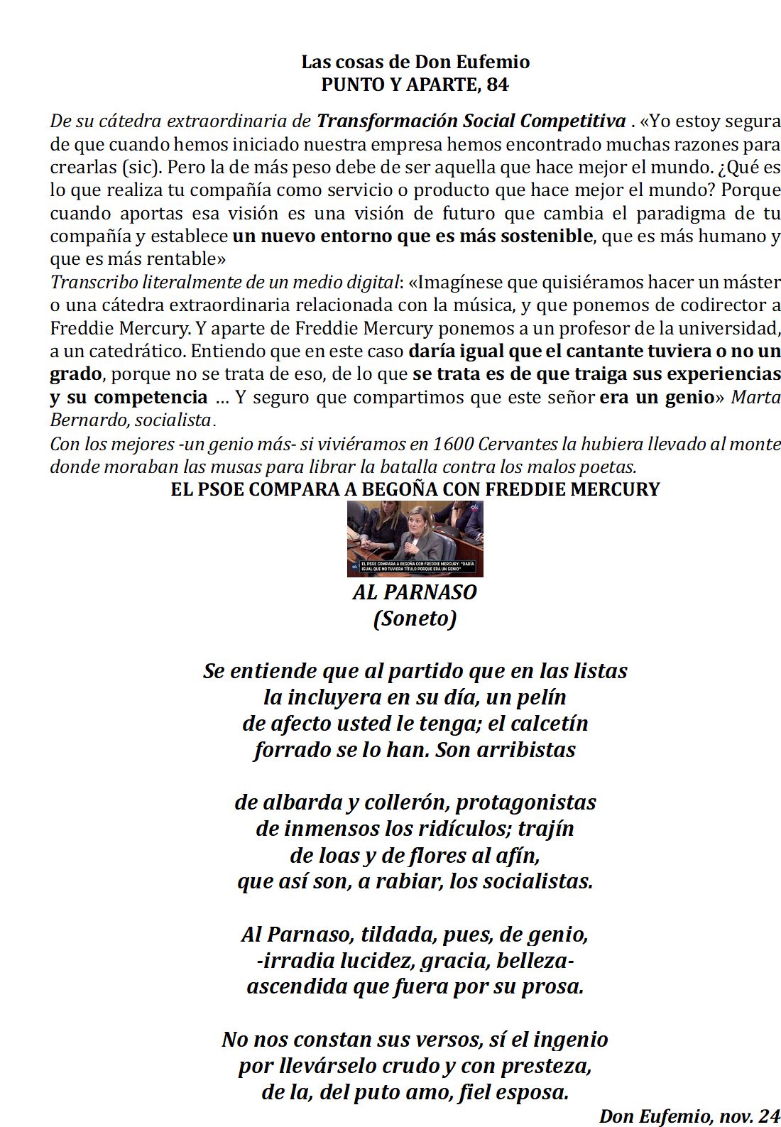 Como sé que le gusta tanto, también le traerán un «balón de baloncesto», y le propongo, junto a su amigo Zapatero, que en los próximos Juegos Olímpicos de Los Ángeles en Estados Unidos, participen con el Equipo Olímpico de Refugiados, junto a rusos y bielorrusos, sin bandera ni himno, seguro que estarán en su ambiente.