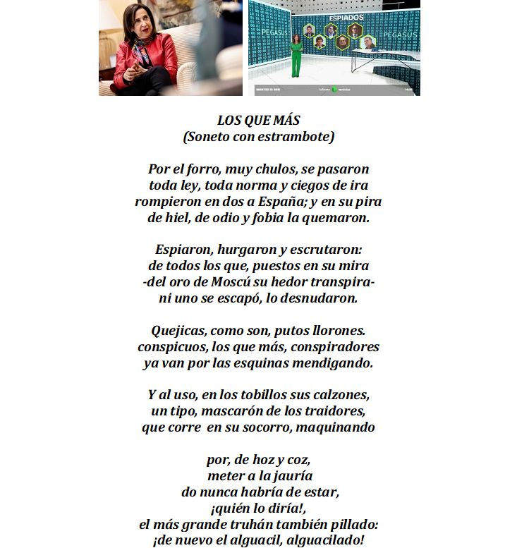Y para ofendidito, Don Sánchez que, ahora, se queja de que también él ha sido espiado: parece ser que le han birlado 1 Gb de de su móvil; de selfis, dicen las malas lenguas. Otras, no tan malas, apuntan a “los servicios secretos de un país extranjero que trata de desestabilizar a España” ¡Pues claro! ¿Qué esperaban?: blanco y en botella. De todas maneras, la oposición acusa al Gobierno, responsable de de la más torpe, oscura y alarmante gestión de esta crisis y de “crear una gran confusión que pone en peligro la seguridad del Estado”. ¿Estado, qué Estado? Porque esto no lo es. Y el baranda de la cosa, nostra, sin decir en el Congreso esta boca es mía, aún.