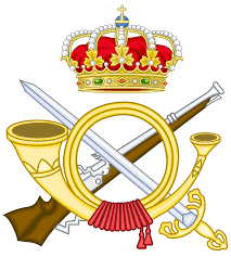 Unos de los primeros emblemas distintivos que utilizó la infantería, allá por 1805, fue la flor de lis que se llevaba en el cuello de la zamarra o levita. Más tarde, combinando en el escudo están: la trompeta de la familia viento-metal, representando el «movimiento», ya que era con lo que desde la antigüedad se mandaban los movimientos de las tropas, el «fuego», por la clásica arma de avancarga, el arcabuz; y el «choque» por la espada, de gran similitud con la Tizona, que la tradición atribuye al Cid Campeador según el anónimo Cantar de Mío Cid. Como elemento timbre, la Corona Real cerrada.