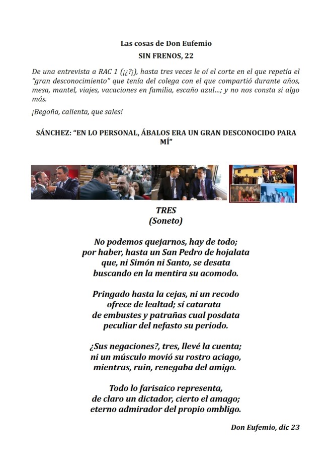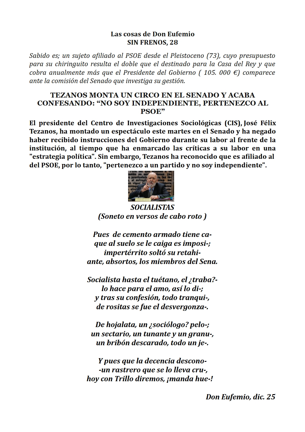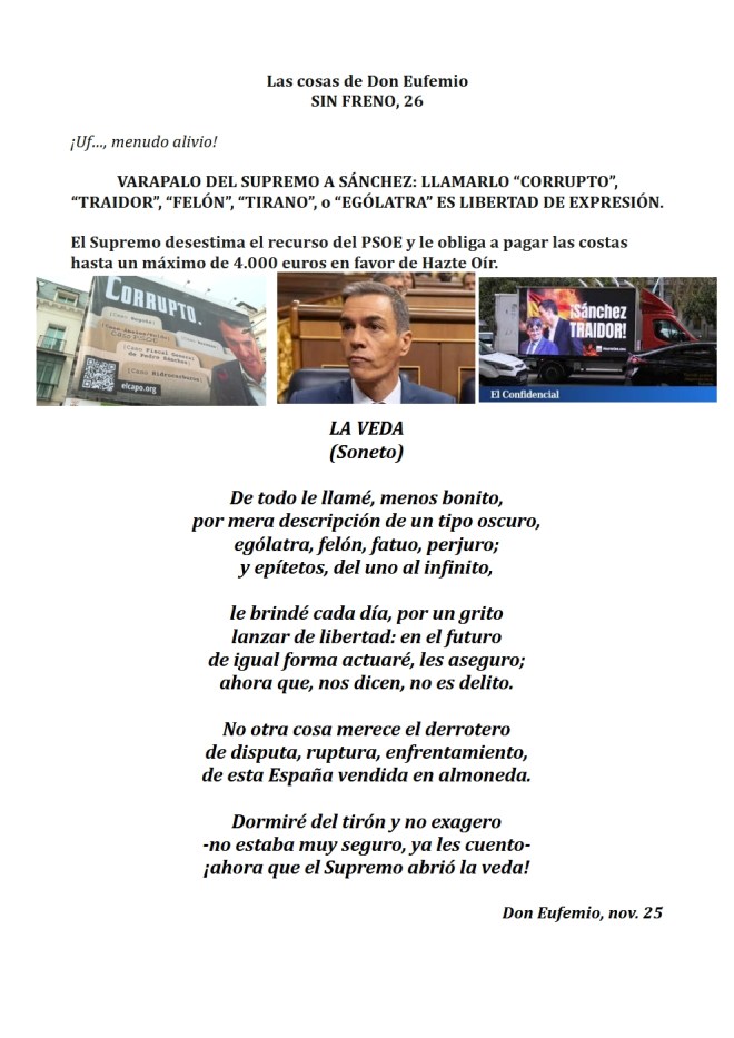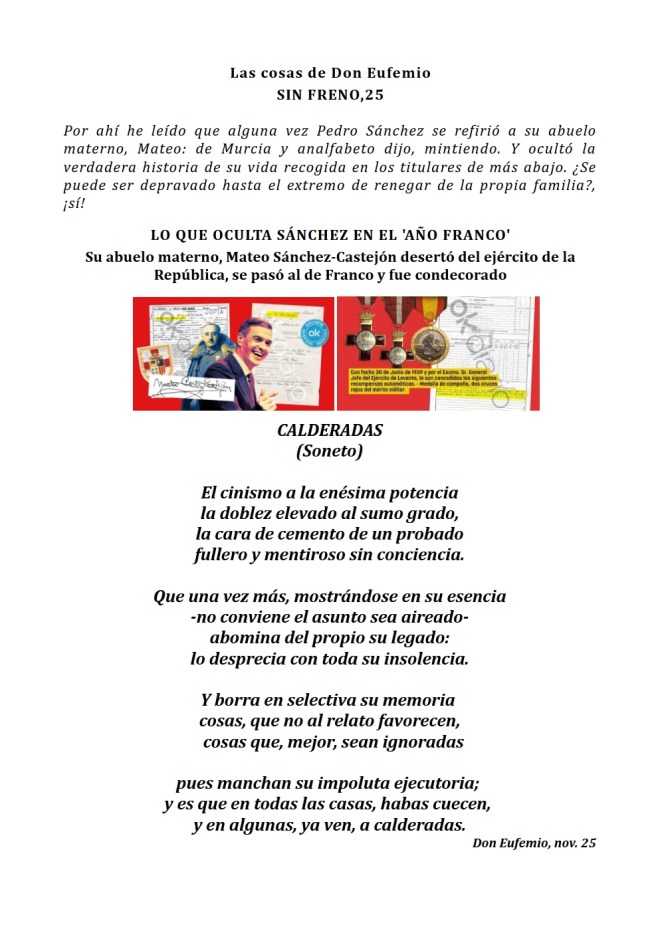 En fín, la fiel Infantería de siempre, la del legionario Braulio…, «La que obedeció a Prim en Castillejos, a Franco en Nador, y a Moscardó en Toledo». Digan lo que digan. ¡Los tercios de Flandes, las Banderas de la Legión, Ceriñola, Bailén, Castillejos, Nador, Brunete, el Pingarrón del Jarama, el Alcázar de Toledo, los infantes que vencieron a las tropas de Napoleón en Bailén, y los que consiguieron en la Guerra de África, Batalla de Castillejos, la primera victoria española en suelo marroquí…, y los 4900 soldados españoles encuadrados en la «División Azul», que se hicieron dignos herederos de los legendarios Tercios Españoles al enfrentarse a más de 40000 soldados soviéticos en una gesta heroica en la que demostraron su valor, disciplina y sacrificio en la batalla de Krasny Bor en plena estepa rusa junto al río Neva muy cerca de Leningrado, hoy San Petersburgo.