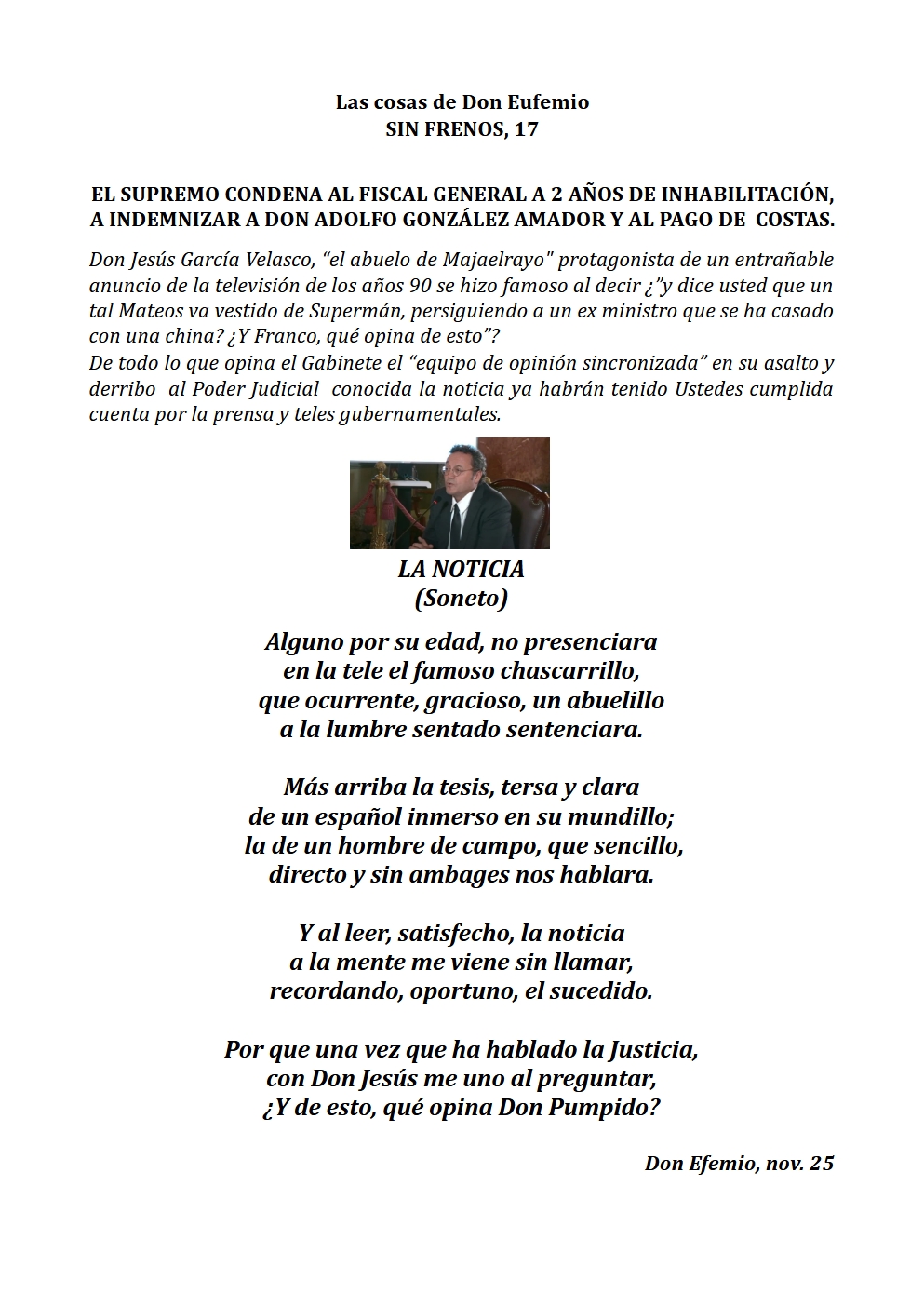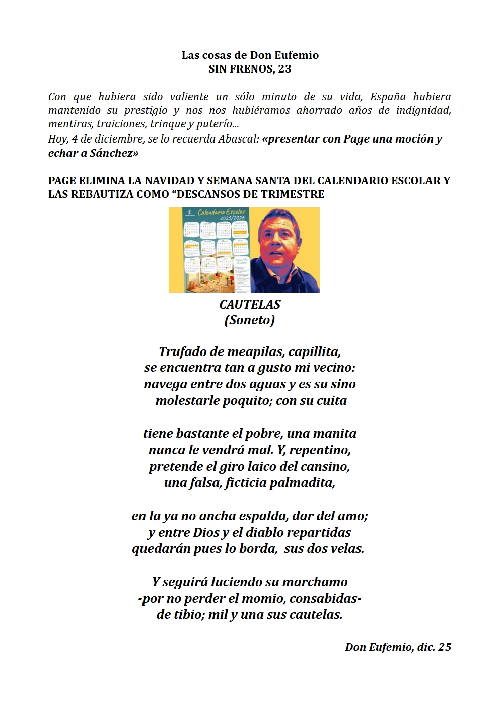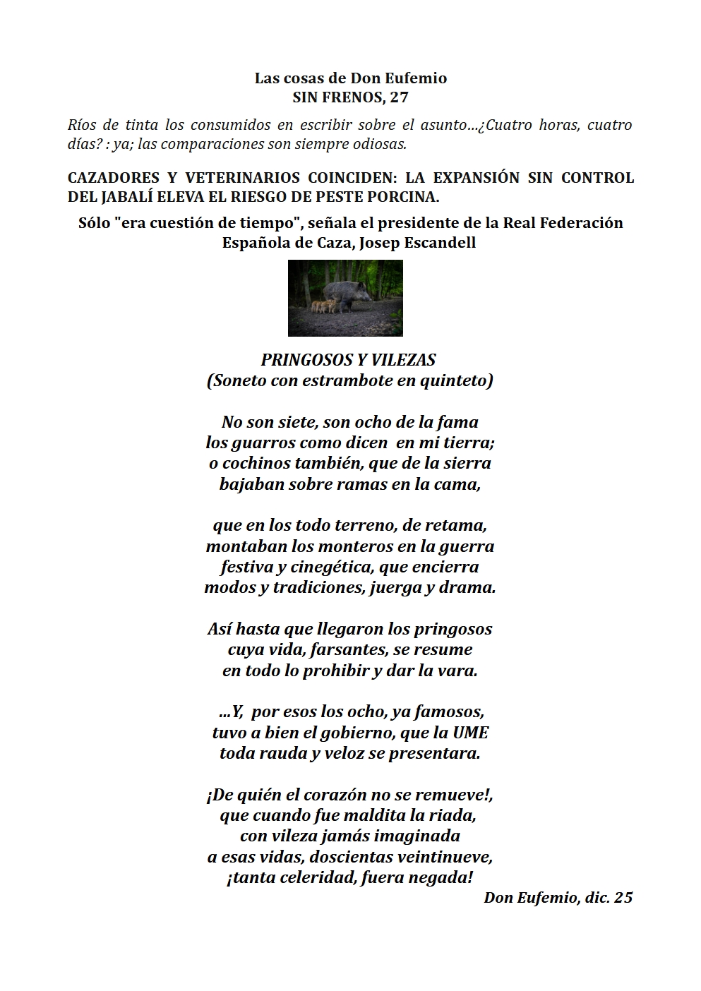 En fín, la fiel Infantería de siempre, la del legionario Braulio…, «La que obedeció a Prim en Castillejos, a Franco en Nador, y a Moscardó en Toledo». Digan lo que digan. ¡Los tercios de Flandes, las Banderas de la Legión, Ceriñola, Bailén, Castillejos, Nador, Brunete, el Pingarrón del Jarama, el Alcázar de Toledo, los infantes que vencieron a las tropas de Napoleón en Bailén, y los que consiguieron en la Guerra de África, Batalla de Castillejos, la primera victoria española en suelo marroquí…, y los 4900 soldados españoles encuadrados en la «División Azul», que se hicieron dignos herederos de los legendarios Tercios Españoles al enfrentarse a más de 40000 soldados soviéticos en una gesta heroica en la que demostraron su valor, disciplina y sacrificio en la batalla de Krasny Bor en plena estepa rusa junto al río Neva muy cerca de Leningrado, hoy San Petersburgo.