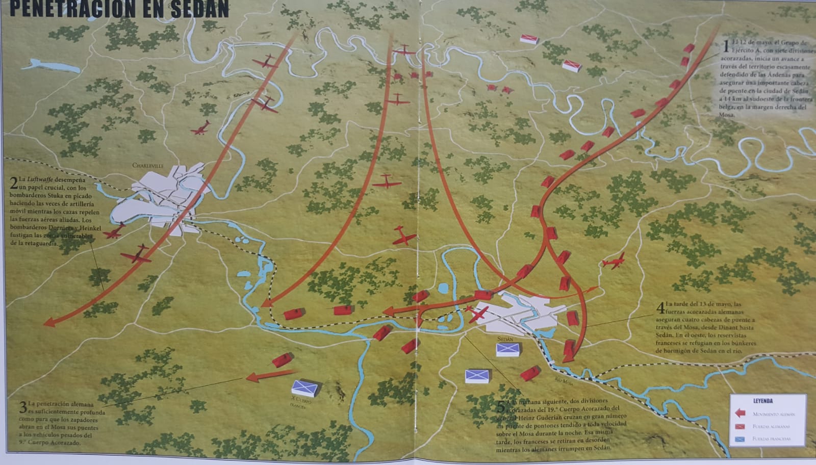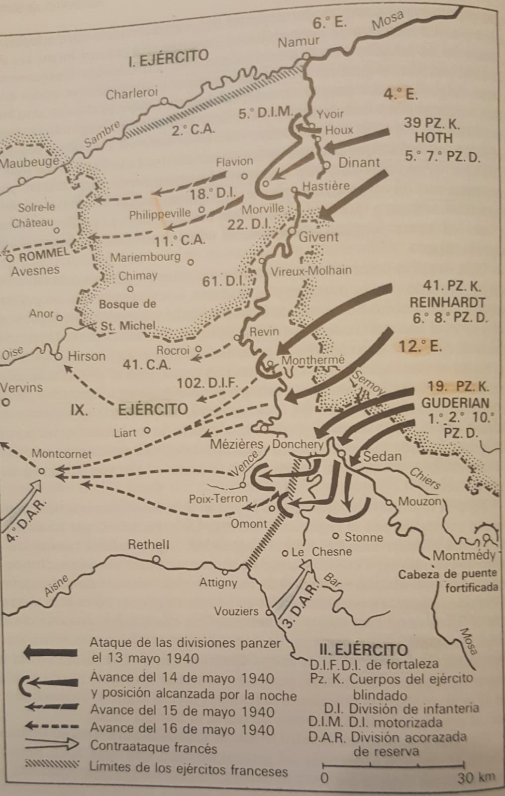 En Sedan había 2 Ejércitos franceses EII (Huntziger) al Este y EIX (Corap) al W, contactaban en la confluencia del Mosa con el canal Ardenas. El EIX, con parte que se desplazaba a pie, tenía que ir al Mosa de Namur a Givet. Calculaban 5 días y otro tanto para sus enemigos.