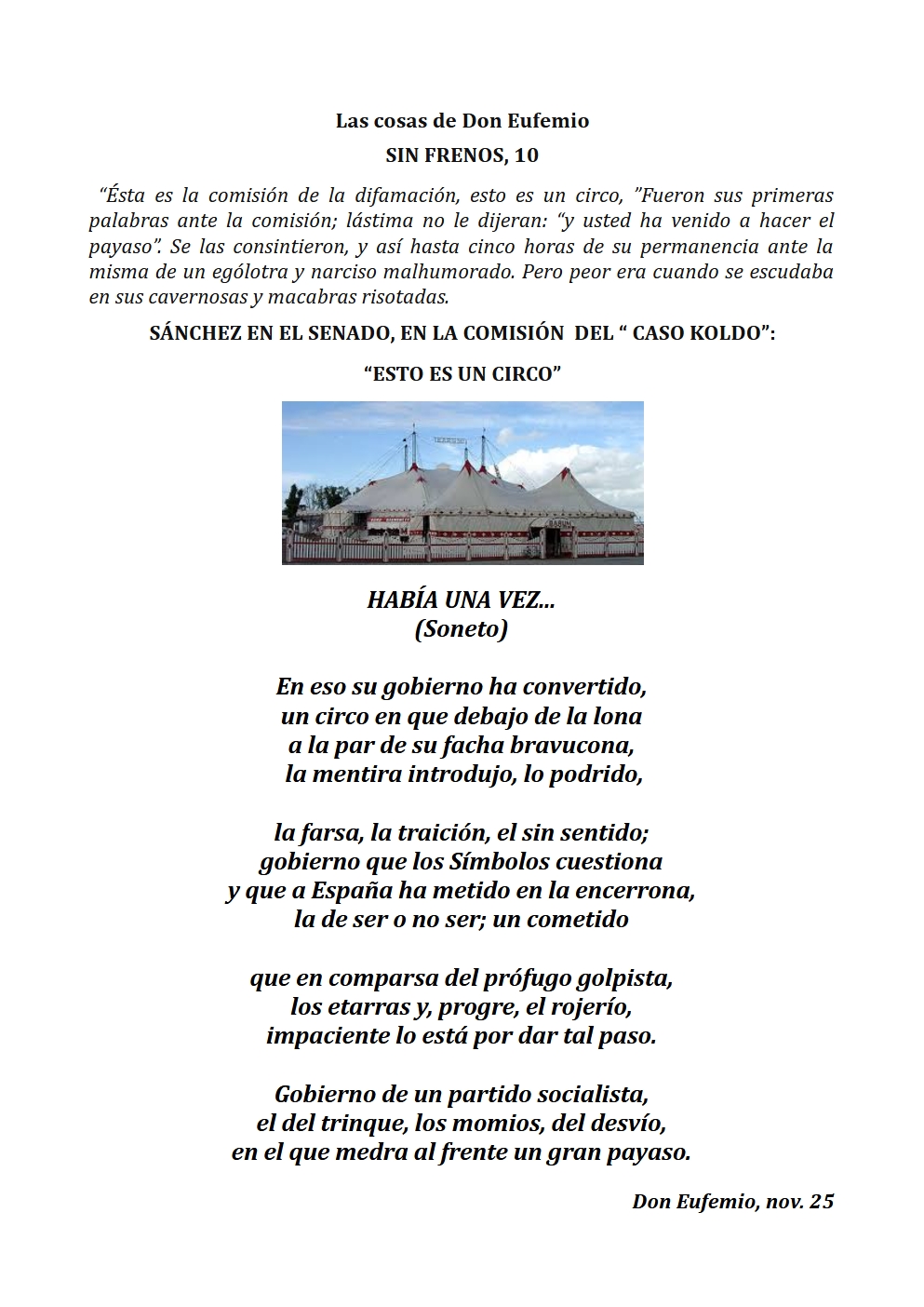 Pero el «veremos» pendiente es la Monarquía, que trajo la democracia a España, no es democracia, que solo solo lo son «ellos y sus circunstancias». Lo estamos viendo y lo veremos. Azaña pensaba, mal intencionado, soberbio, pero pensaba. No sé qué es peor; Zapatero y Sánchez no tiene esa capacidad y se rigen por sentimientos mal condimentados y muy peligrosos, de esos que a la postre dicen «No era eso, no era eso» cuando destrozan una nación y ponen tierra o mar por medio, a salvo y con dinero. Al fin, la tristeza es su fortuna. Nada hay peor que un tonto con alto coeficiente de inteligencia y que escale en el poder político o en el militar si le sirve de puente para esta.