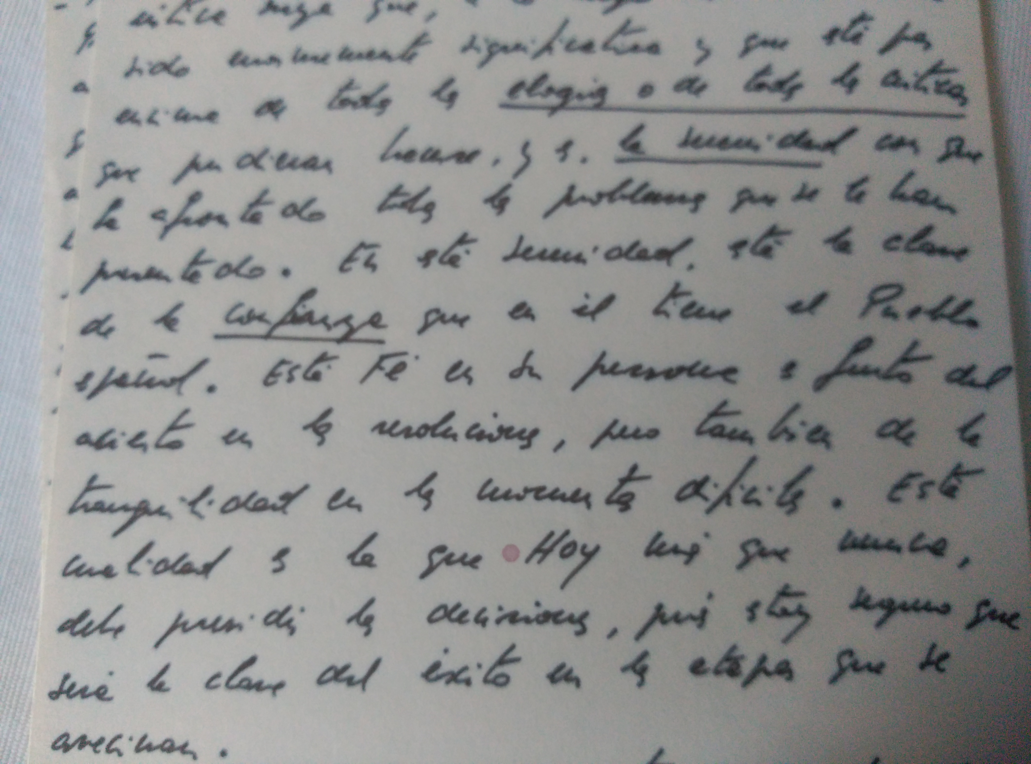 ‹‹Conocéis mejor que yo su gran personalidad y su obra. Pero quiero resaltar una característica suya que, a lo largo de su vida ha sido enormemente significativa y que está por encima de todos los elogios o de todas las críticas que pudieran hacerse, y es, la serenidad con que ha afrontado todos los problemas que se le han presentado. En esta serenidad, está la clave de la confianza que en él tiene el Pueblo [sic] español. Esta Fé [sic] en su persona es fruto del acierto en las resoluciones, pero también de la tranquilidad en los momentos difíciles. Esta cualidad es la que Hoy [sic] más que nunca, debe presidir las decisiones, pues estoy seguro que será la clave del éxito en las etapas que se avecinan››.