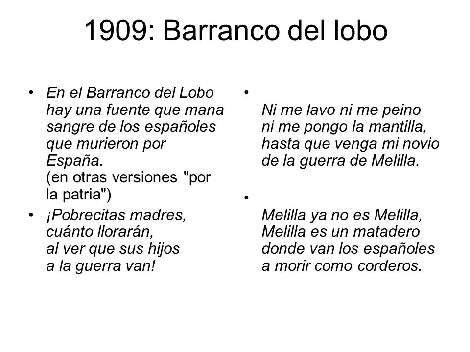 Se repiten en 1909, “guerra de Melilla”, de la que queda el recuerdo de la Semana Trágica y los acontecimientos del Barranco del Lobo, convertidos en tragedia en el ámbito popular sin ajustarse a la total realidad de los hechos. Todavía son numerosos los lugares españoles en los que sigue viva aquella canción… “En el barranco del lobo hay una fuente que mana…”
